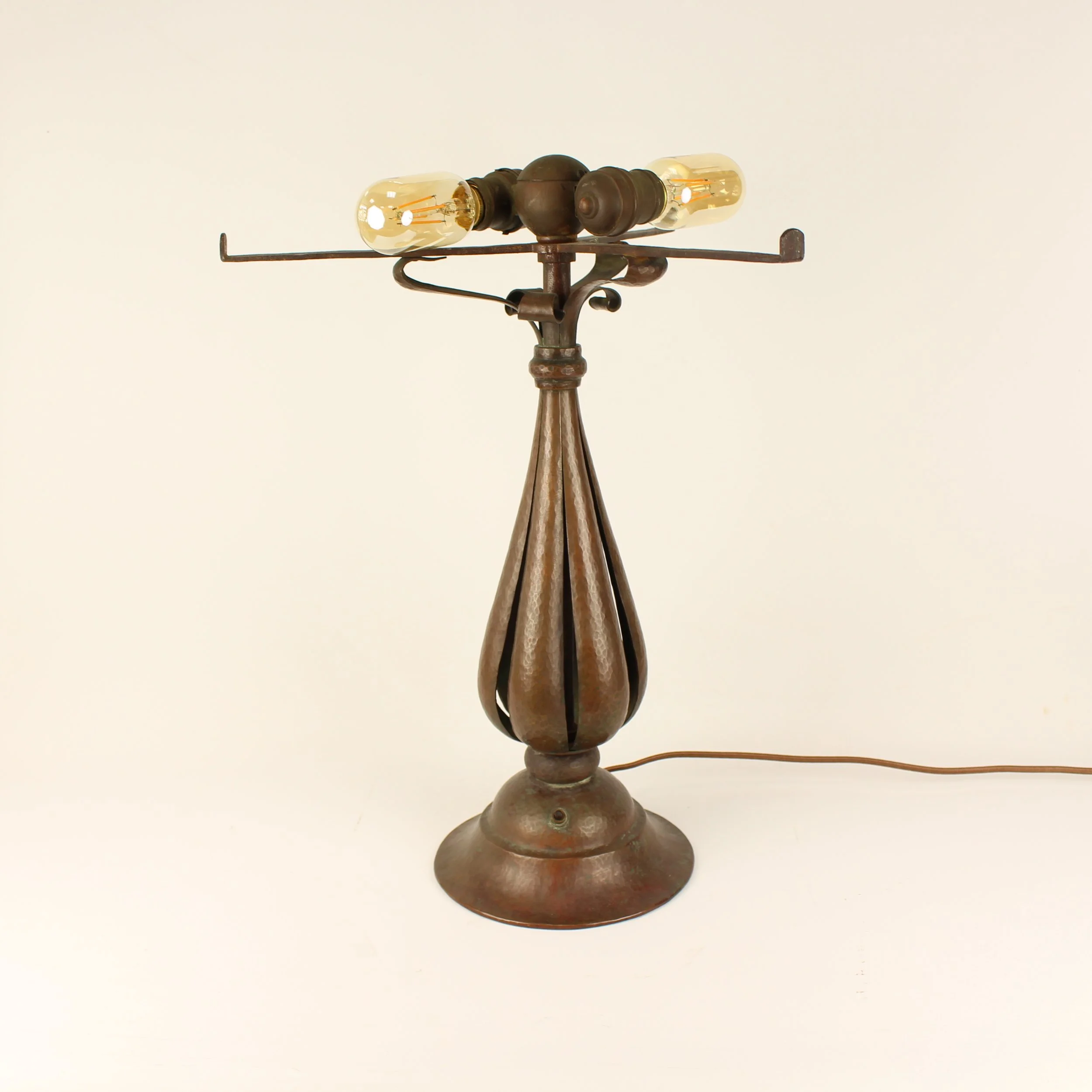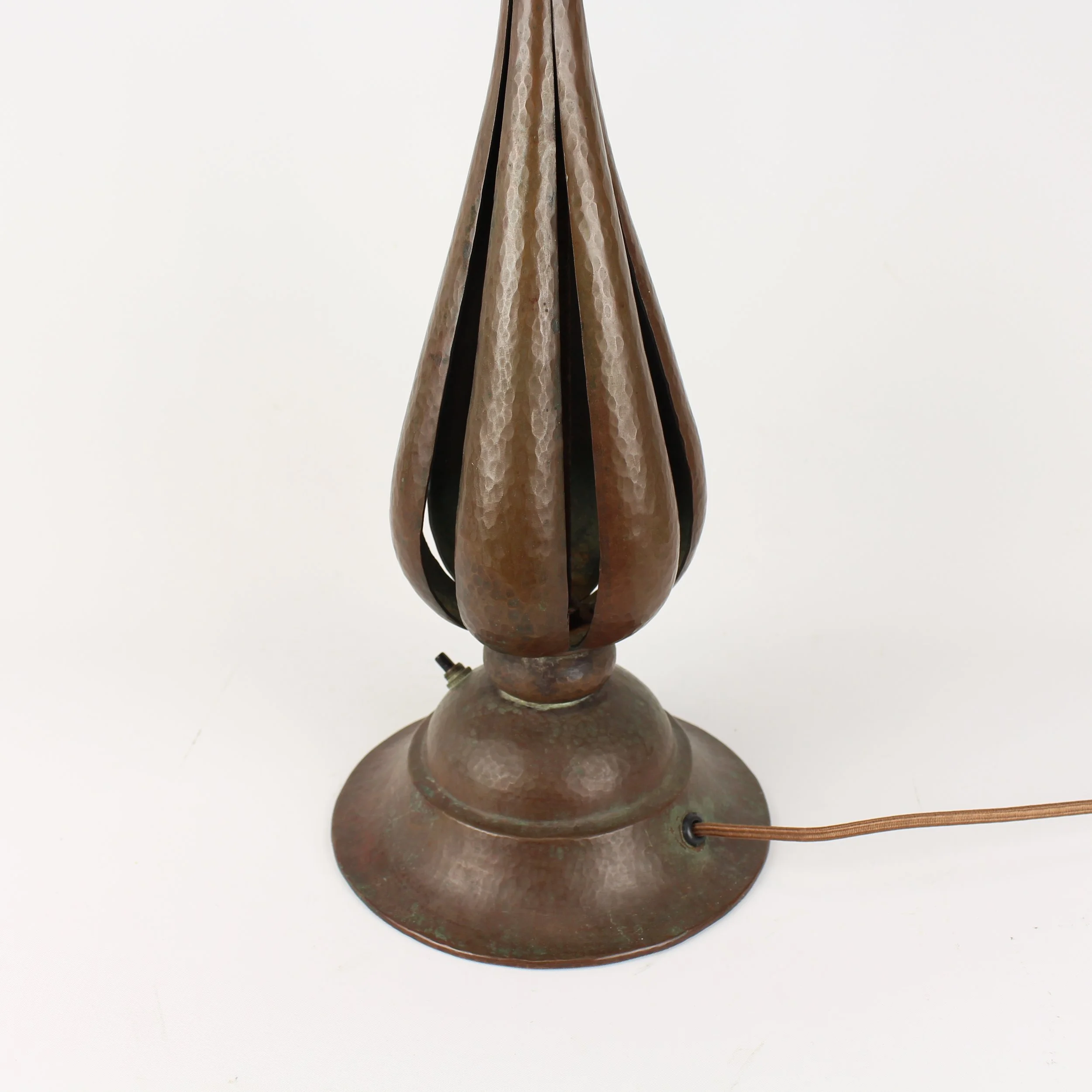 Benedict Art Studios / OMS (Onondaga Metal Shops) arts and crafts hammered copper lamp with period Japanese split bamboo shade, Gustav Stickley Lamp Shade No. C-16. Three arm iron shade-rest with original sockets. Excellent condition with a wonderful original patina. Shade is in excellent original condition with a new hand-stitched golden silk liner installed. Rewired with period style cloth covered cord. Unmarked, but pictured in the Benedict catalog as Lamp No. 222. Gustav Stickley used these Japanese split bamboo shades and also produced a very similar model of this particular lamp (see last picture). East Syracuse, New York. Circa 1908. 24”h x 16”d (shade) x 7.25”d (base). $2900.