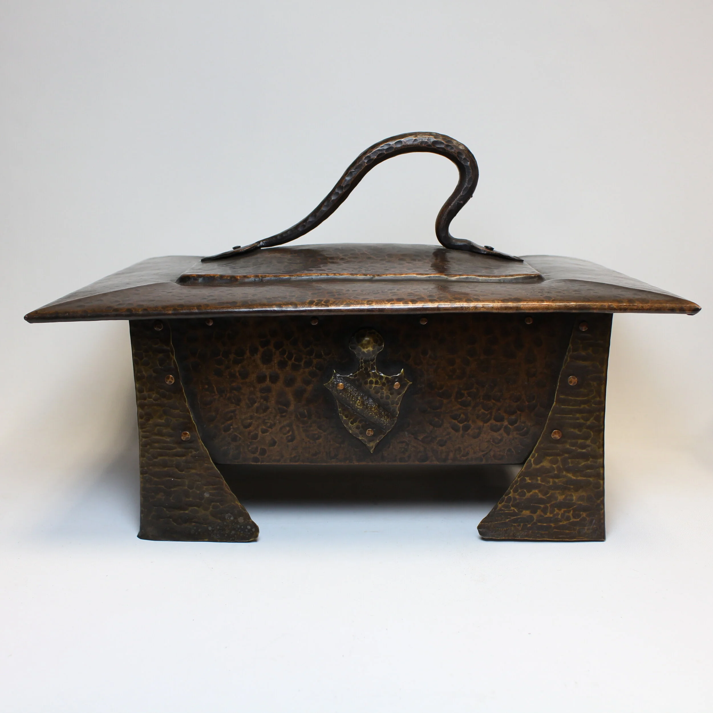 Large Benedict OMS hand hammered copper and brass lidded cigar box with wonderful riveted construction and spade handle. Beautifully restored rich brown patina. This humidor was originally used in the “Gentleman Jim” room in the historic Warwick Hotel in Rittenhouse Square, Philadelphia, PA. Unsigned, but pictured in a period advertisement. Note that the ad’s heading reads “Benedict Art Studios Succeeding The Onondaga Metal Shop”. 12.5”l x 8.5”w x 8.5”h (top of handle). SOLD