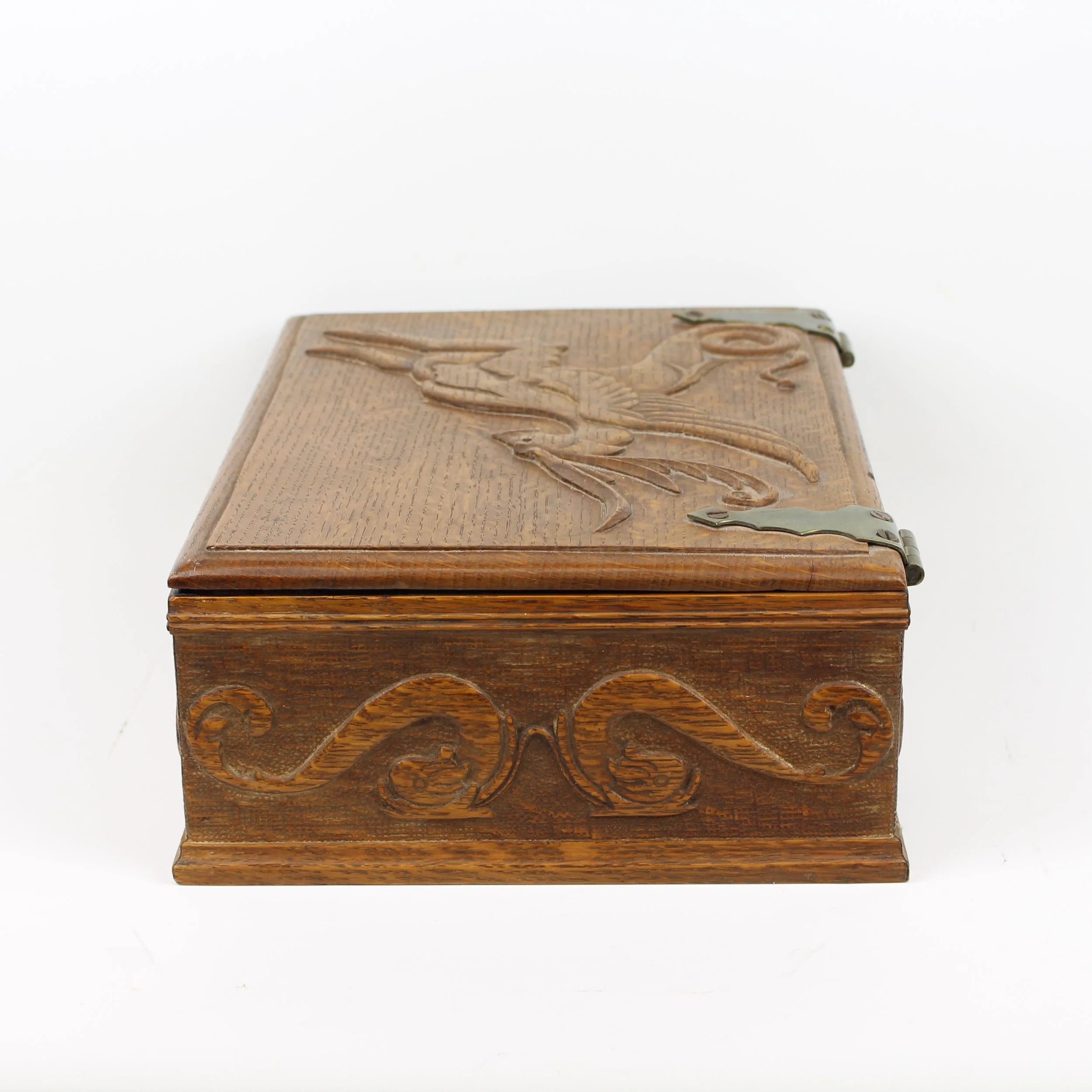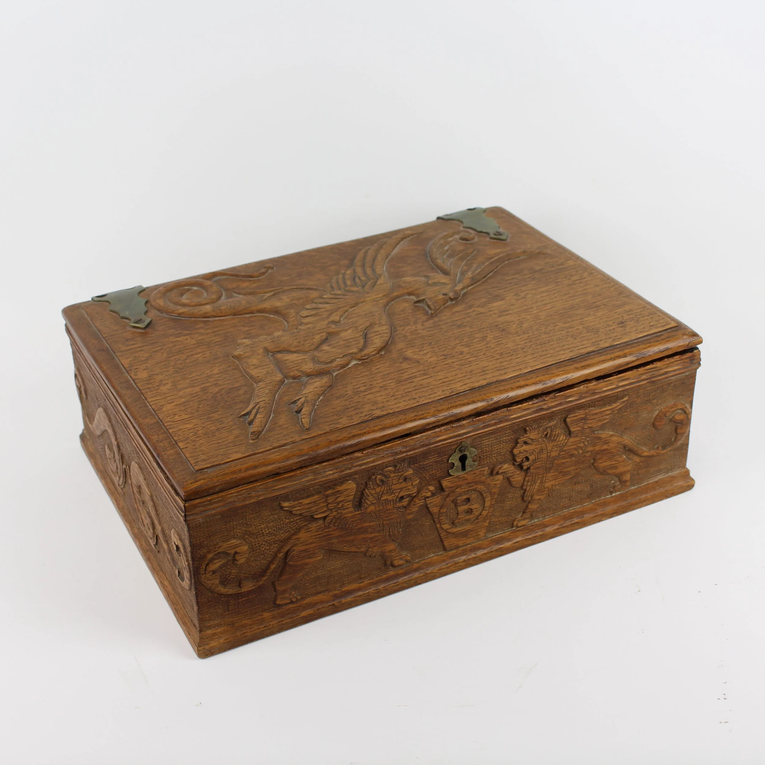 Wonderful large quartersawn oak box fitted with a Gorham sterling silver and ivory vanity or grooming set. Box is dated 1902 on the back panel, and beautifully decorated with hand carved winged lions, griffin and dolphins. There is a single-letter monogram with the initial “B” carved within a keystone on the front panel. This unique Gorham pattern is of blossoming “spring snow” crab apple flowers. Signed on nail buffer with Gorham “Lion, Anchor & G” mark and “Sterling, 3 & Star (1888 date mark)”. Overall condition is excellent. Lid has a very slight warp which can be seen in the photos below. Lock is fully functional and includes a working skeleton key. From a wonderful Main-Line Philadelphia estate. First time ever to market. 13”w x 9.5”d x 4.5”h. SOLD