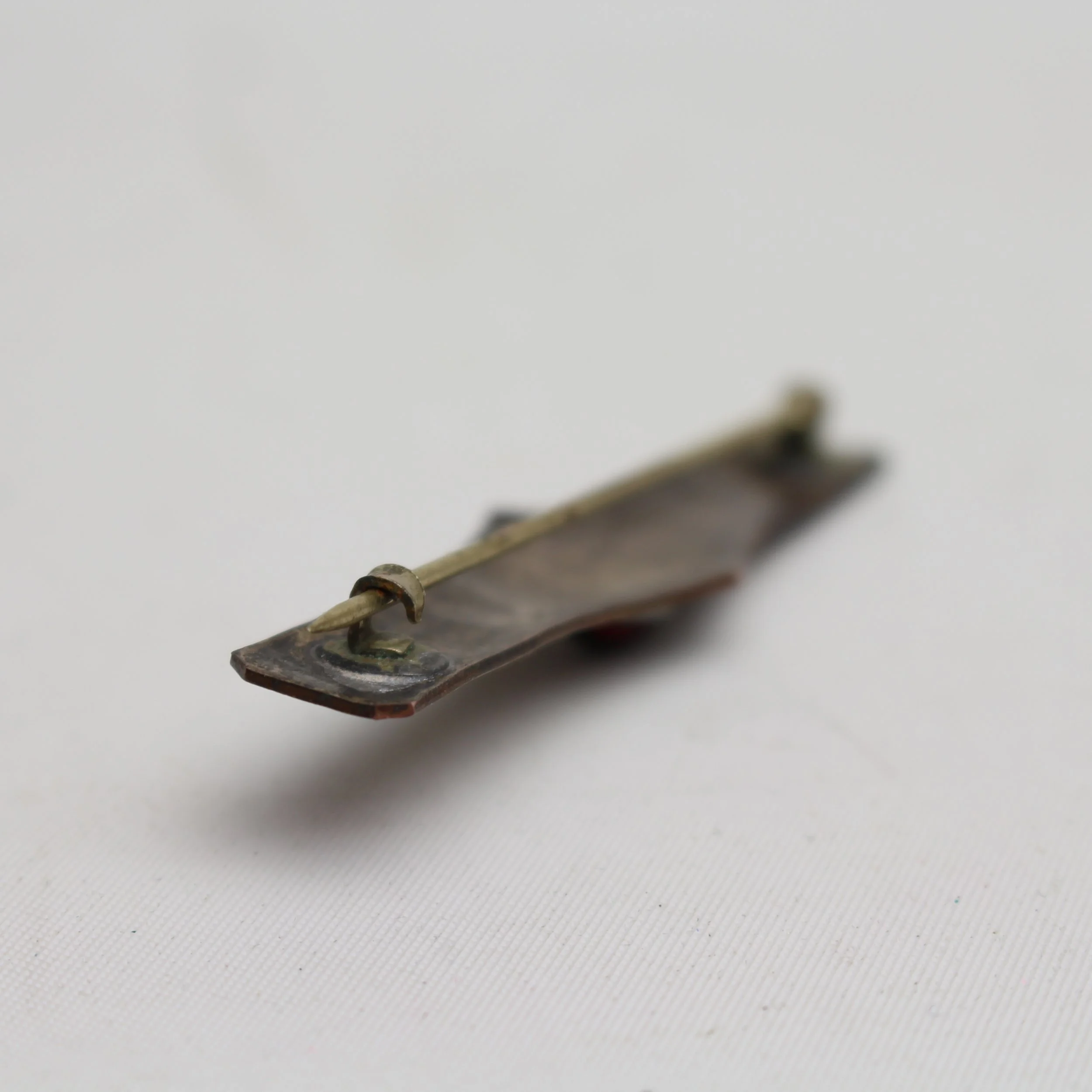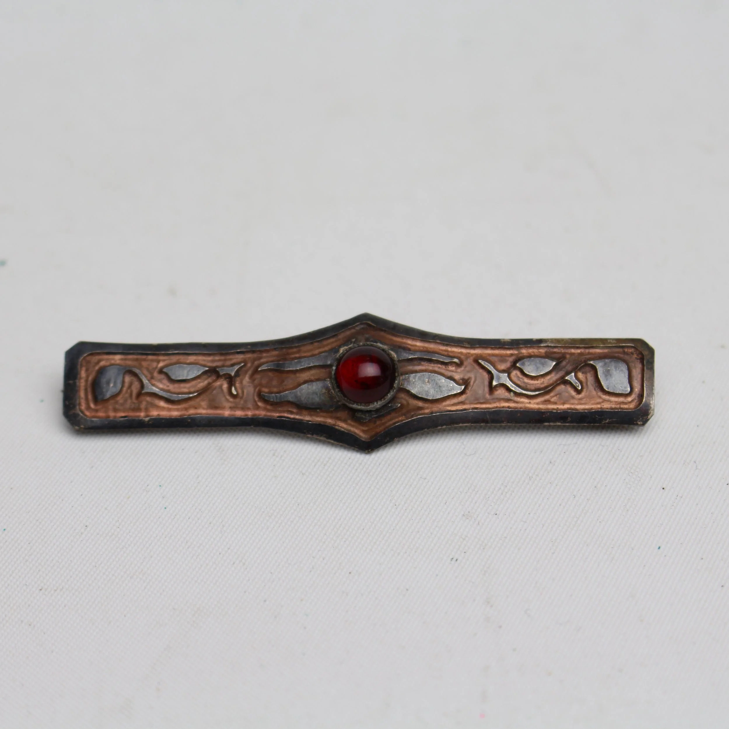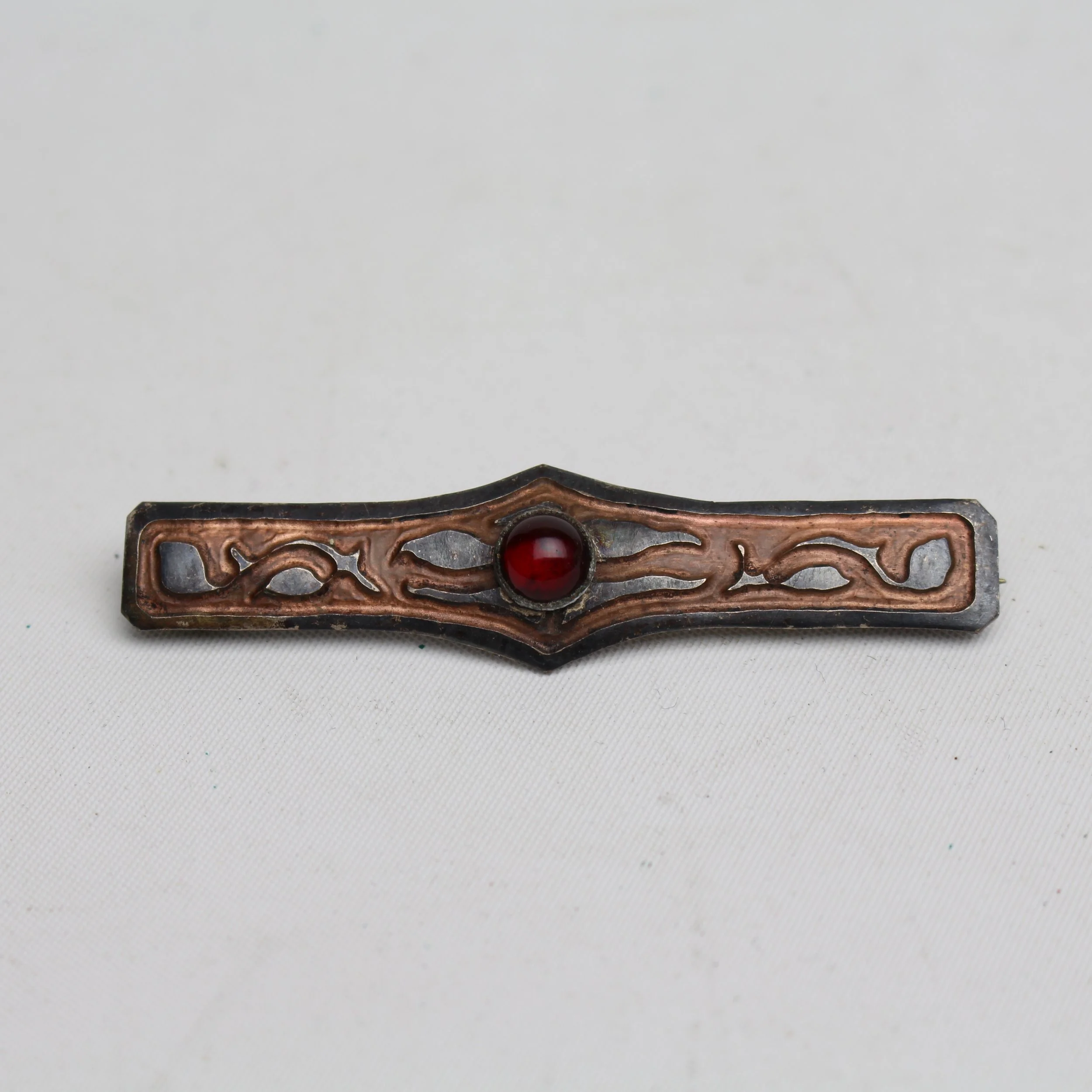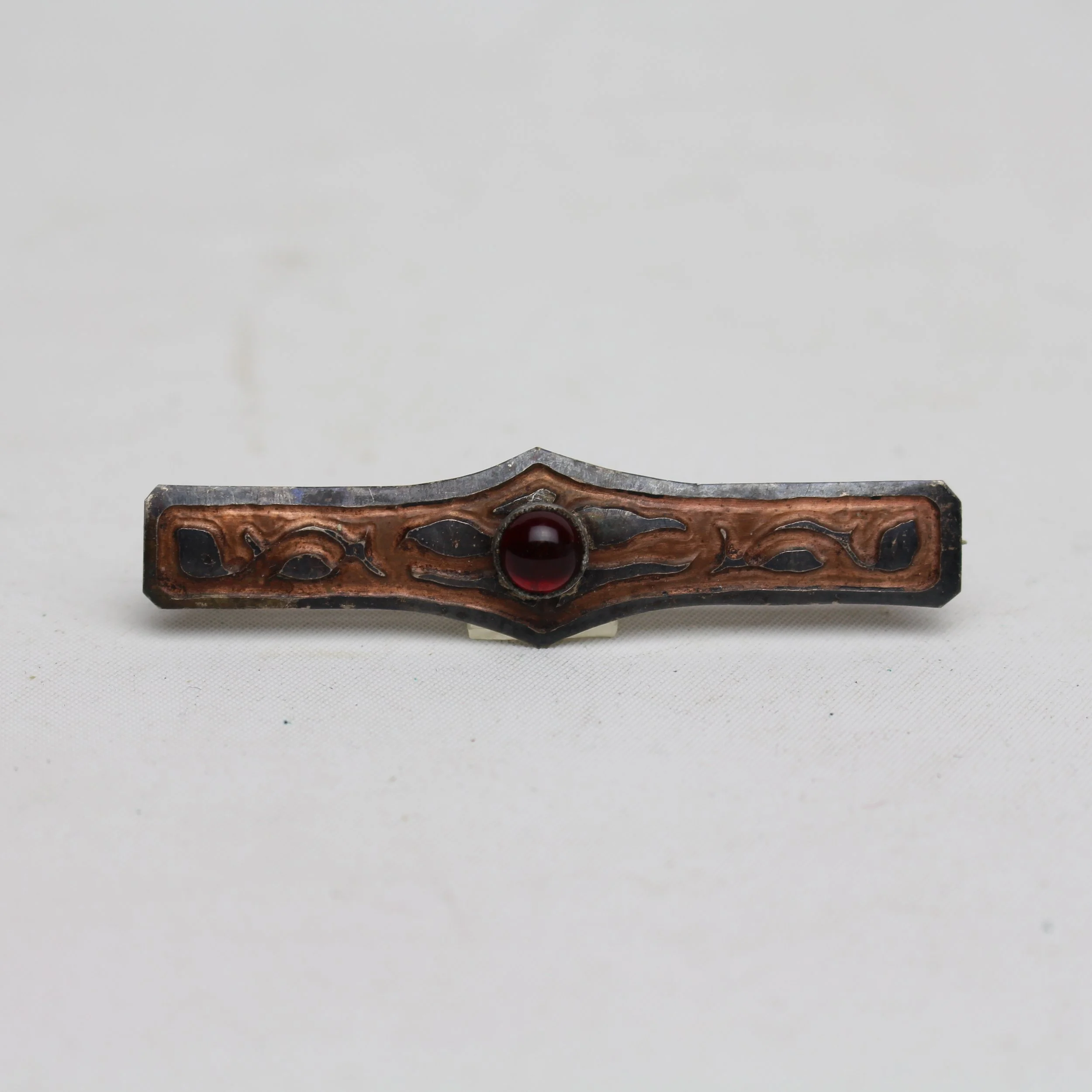 Rare early Craftsman Studios hand hammered and acid etched copper bar pin with red cabochon jewel. Excellent condition with beautiful original patina. Pictured in their original catalog as shape no. 105, each shape was available in 4 different designs. This particular design can be seen on the same page, used on shape no. 113. Unmarked. Brooklyn, New York. Circa 1920’s. 2.75”l x 1/2”w. $295.