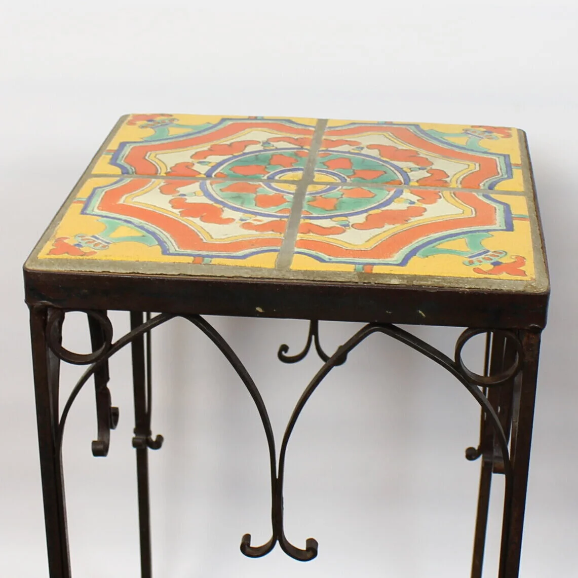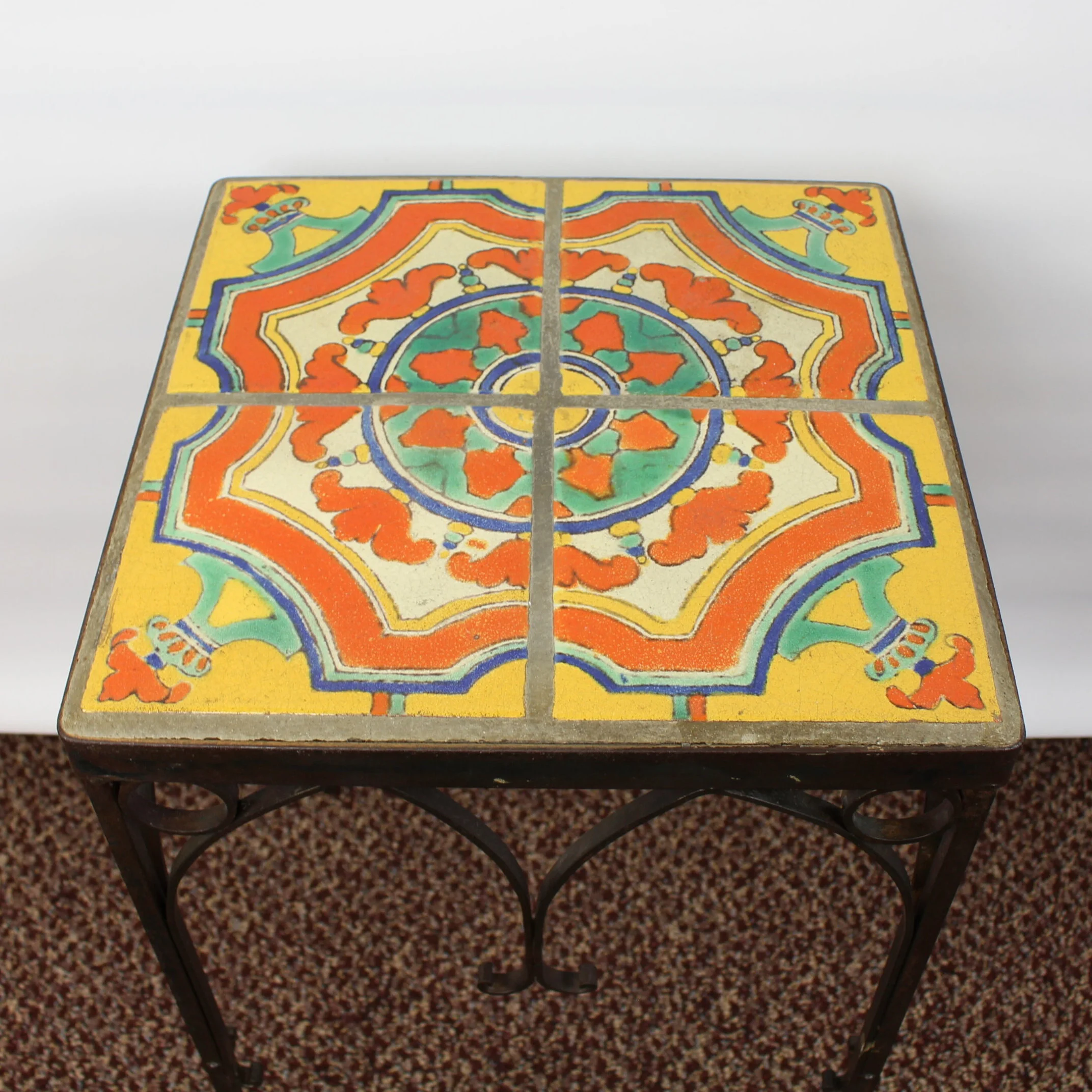 D&M Tile Co., Los Angeles, California, Spanish revival tile-top table with very attractive wrought iron base. Wonderful vibrant colors and condition with no damage or restoration. Excellent original finish to base. Circa 1920s-1930s. Unmarked. 20”h x 13”sq top (6”sq tiles). SOLD