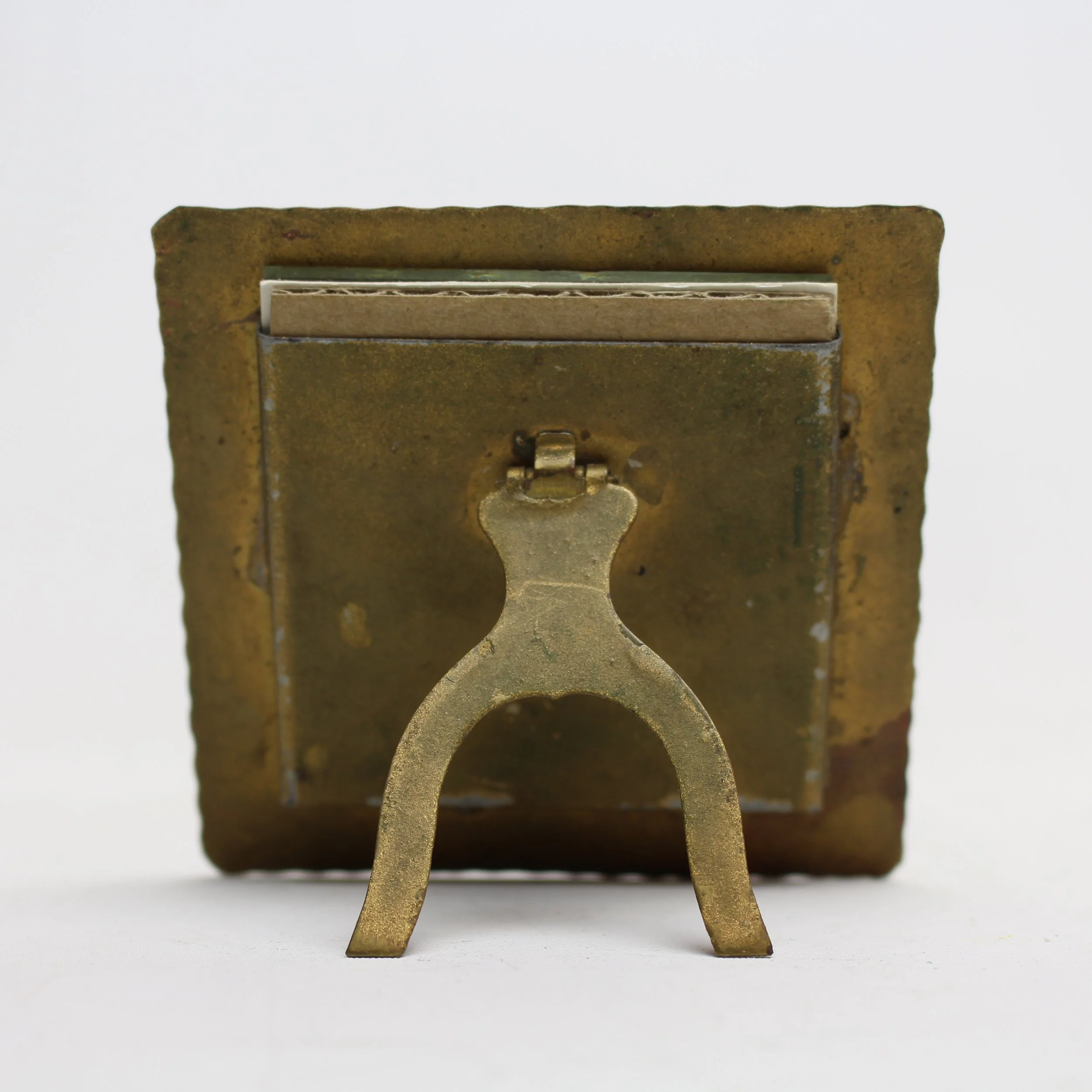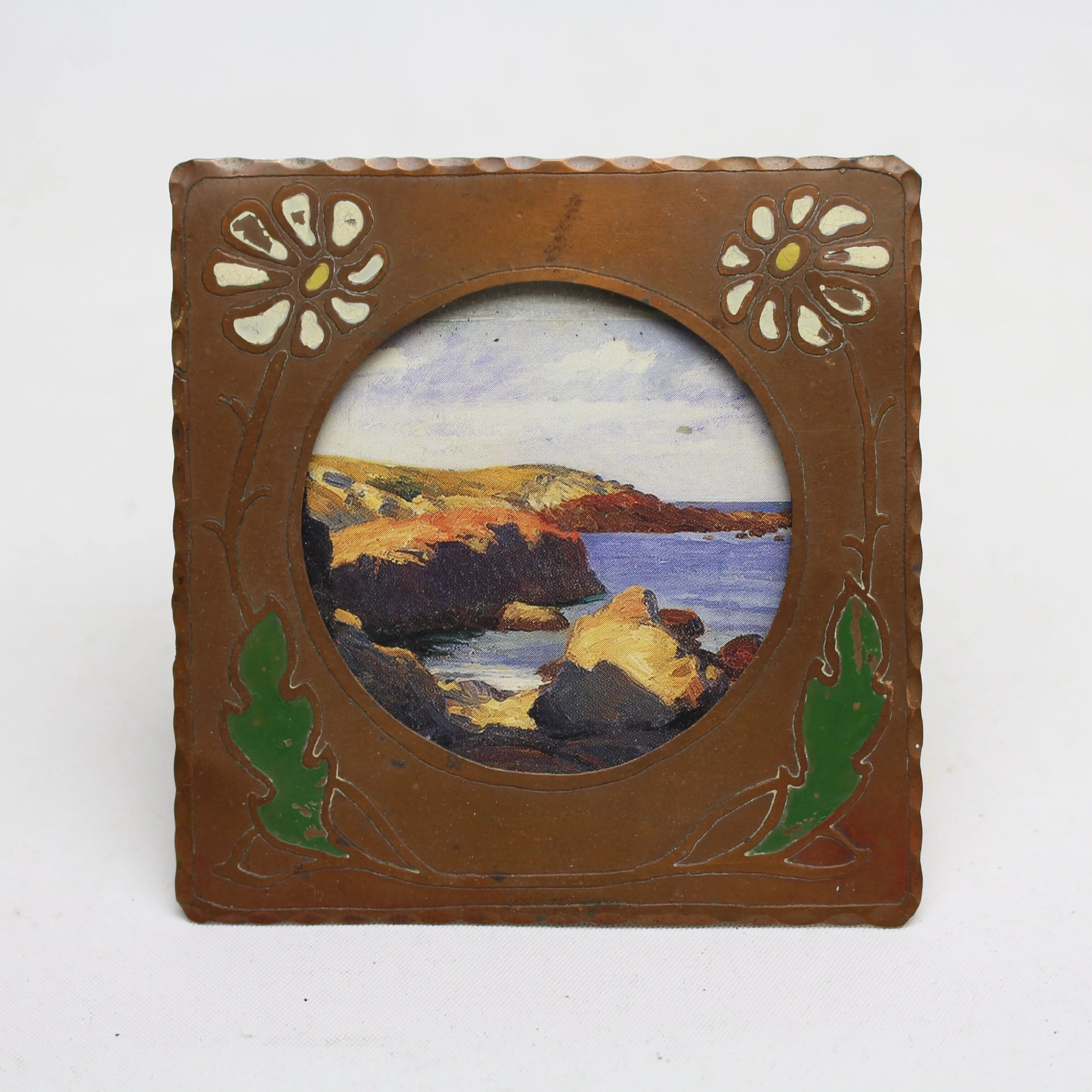 Early Craftsman Studios hand hammered and acid etched copper picture frame with enameled flowers and leaves. Excellent original patina with some very minor enamel loss. Unmarked. Brooklyn, New York. Circa 1920’s. 3.5”h x 3.5”w with a 2.25”d round picture window. SOLD