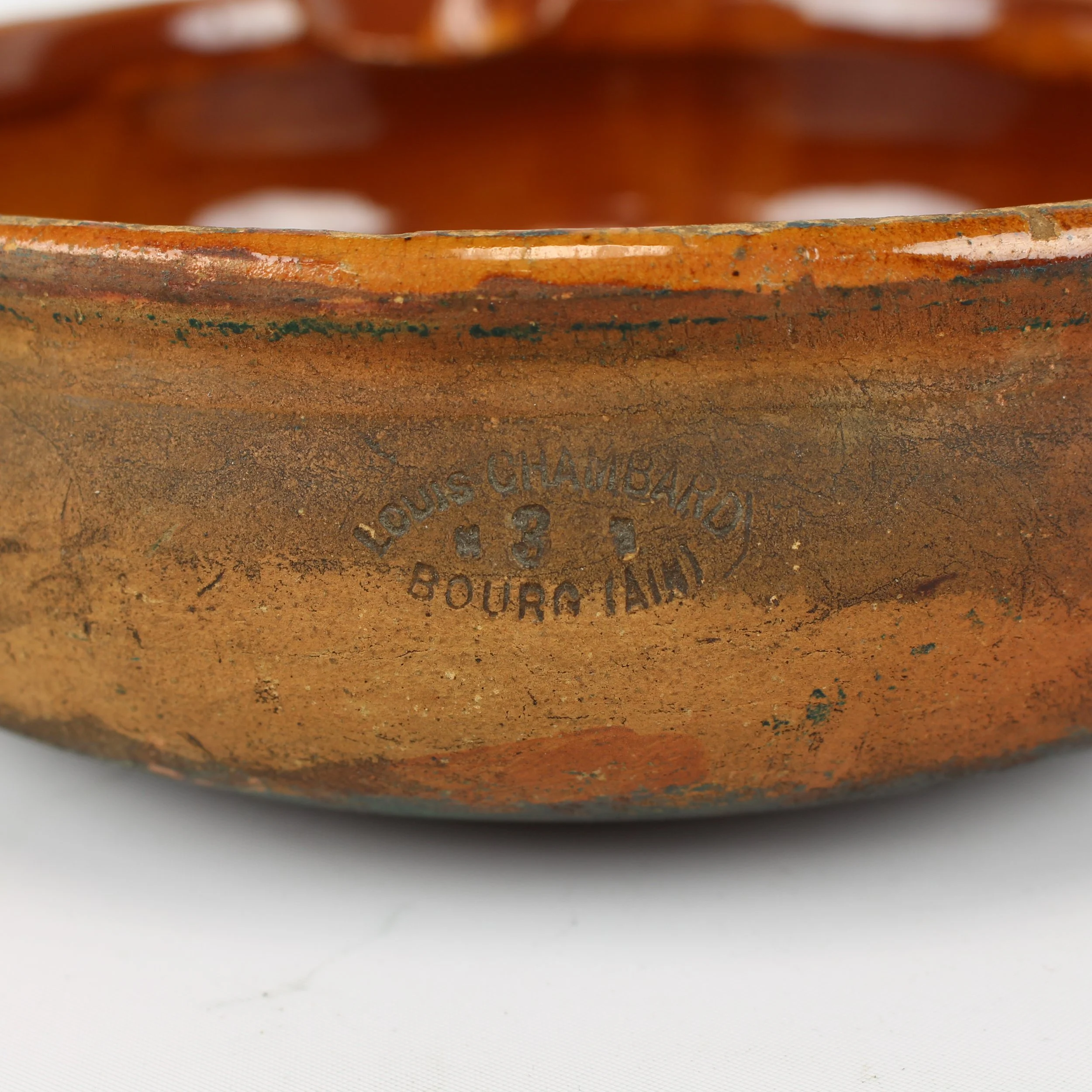 Gustav Stickley Arts & Crafts chafing dish, model #352. Made in hand hammered copper with quartersawn oak handles and base. Constructed with copper rivets and attached to oak base with 21 iron pyramid-head screws. Excellent original patina. Original terracotta casserole has multiple rim chips and repaired handle. Burner cover is not present. Craftsman Workshops, Eastwood, New York. Circa 1905. Unmarked. 13”h x 16”d (base). SOLD