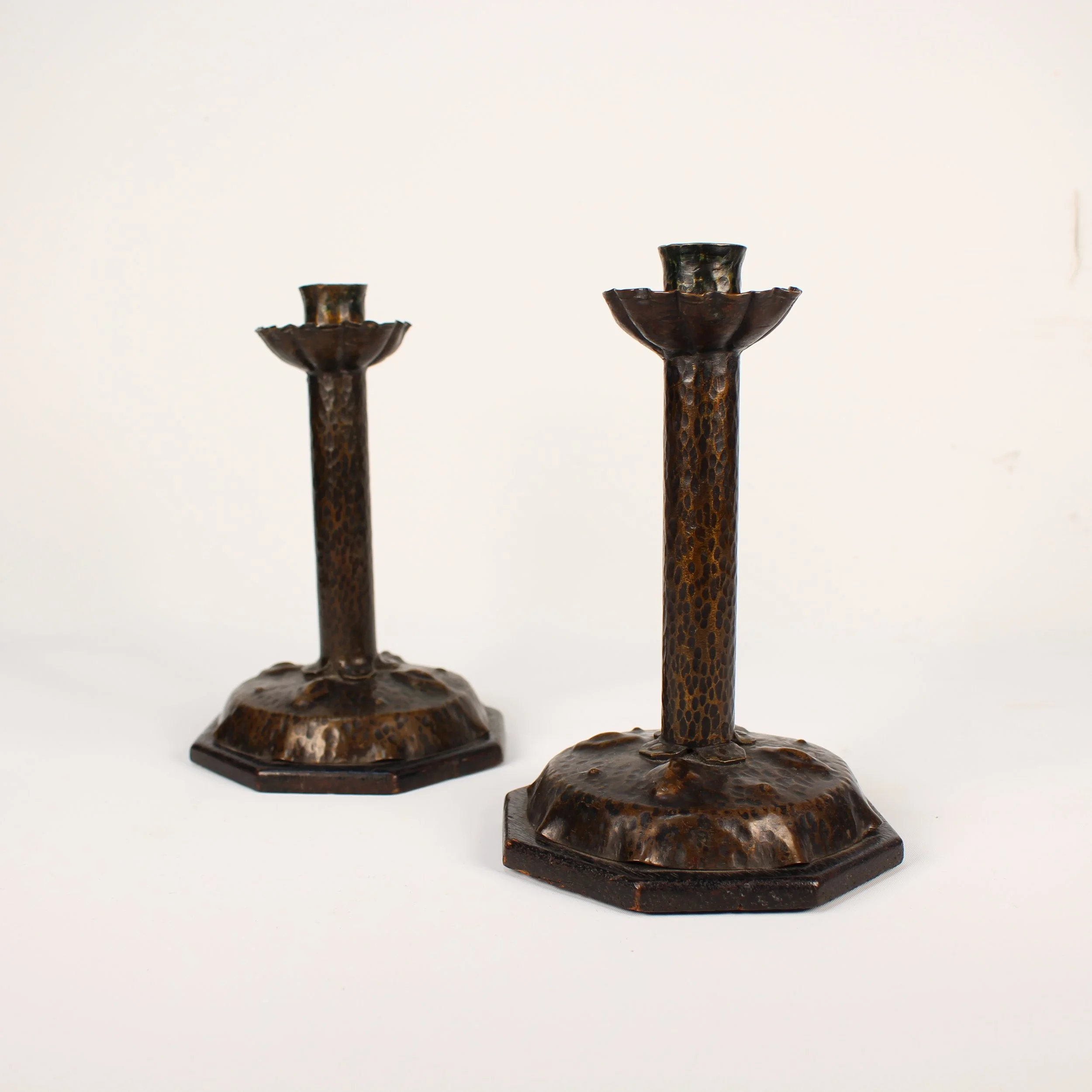 Wonderful pair of arts and crafts hammered copper candlesticks with octagonal oak bases. Excellent original patina. Skillful hammering with great repousse details and riveted construction. The candlesticks are weighted and feel quite substantial. The oak bases are reminiscent of Joseph Heinrichs’ work, and add a lot to the overall design. Unmarked. Circa 1910’s. 7”h x 5”d. $550.