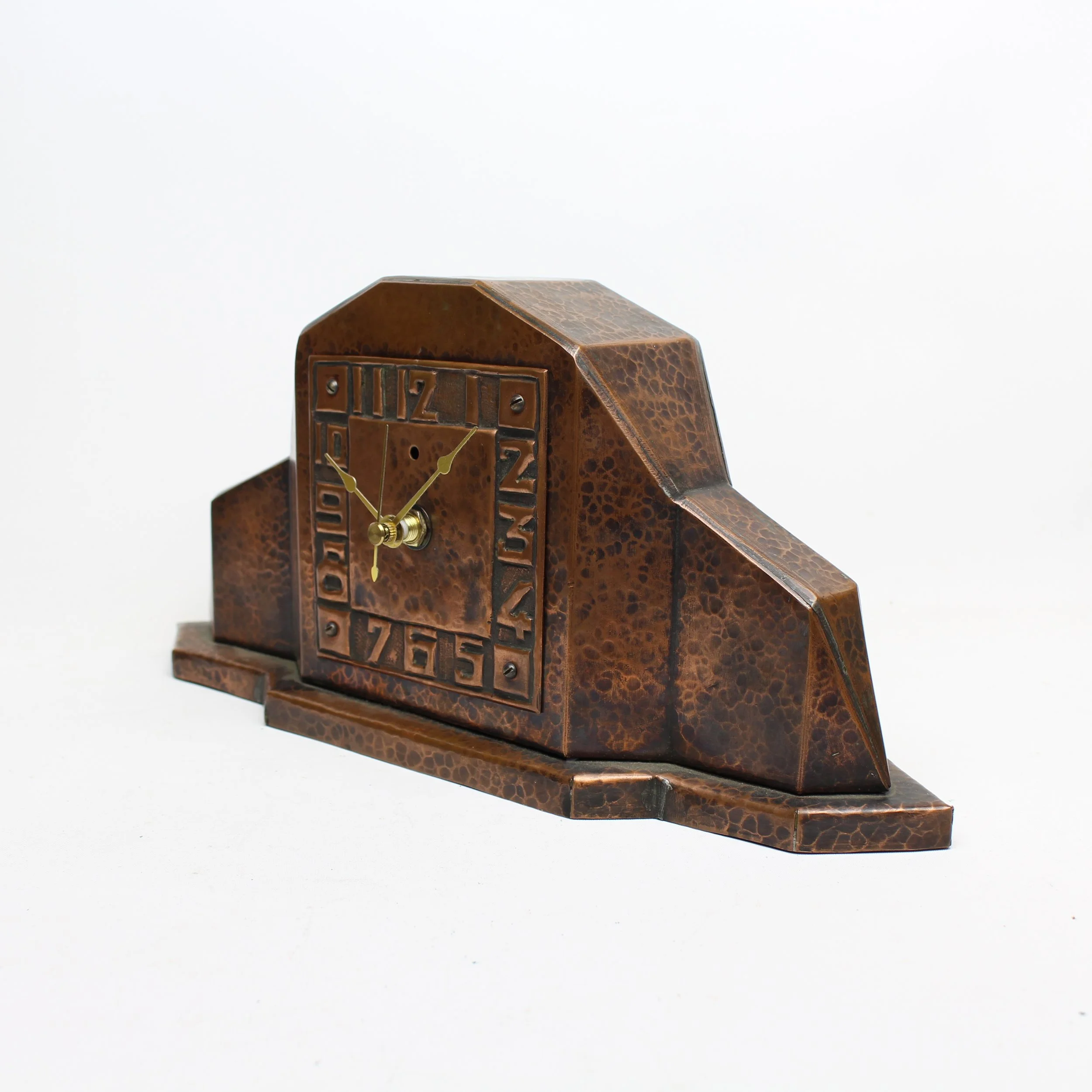 Wonderful Arts & Crafts hand hammered copper mantle clock with Art Deco styled case. Beautifully made mission dial with repousse numerals. This clock was originally designed to house an electric movement but came to us as an empty case. It likely used a Telechron movement based on the small circular window just below the 12 o’clock marker. Excellent original patina with great hammering. New quartz battery operated movement installed. Unmarked. CIrca 1920’s. 12.75”l x 3.5”w x 5.75”h. SOLD