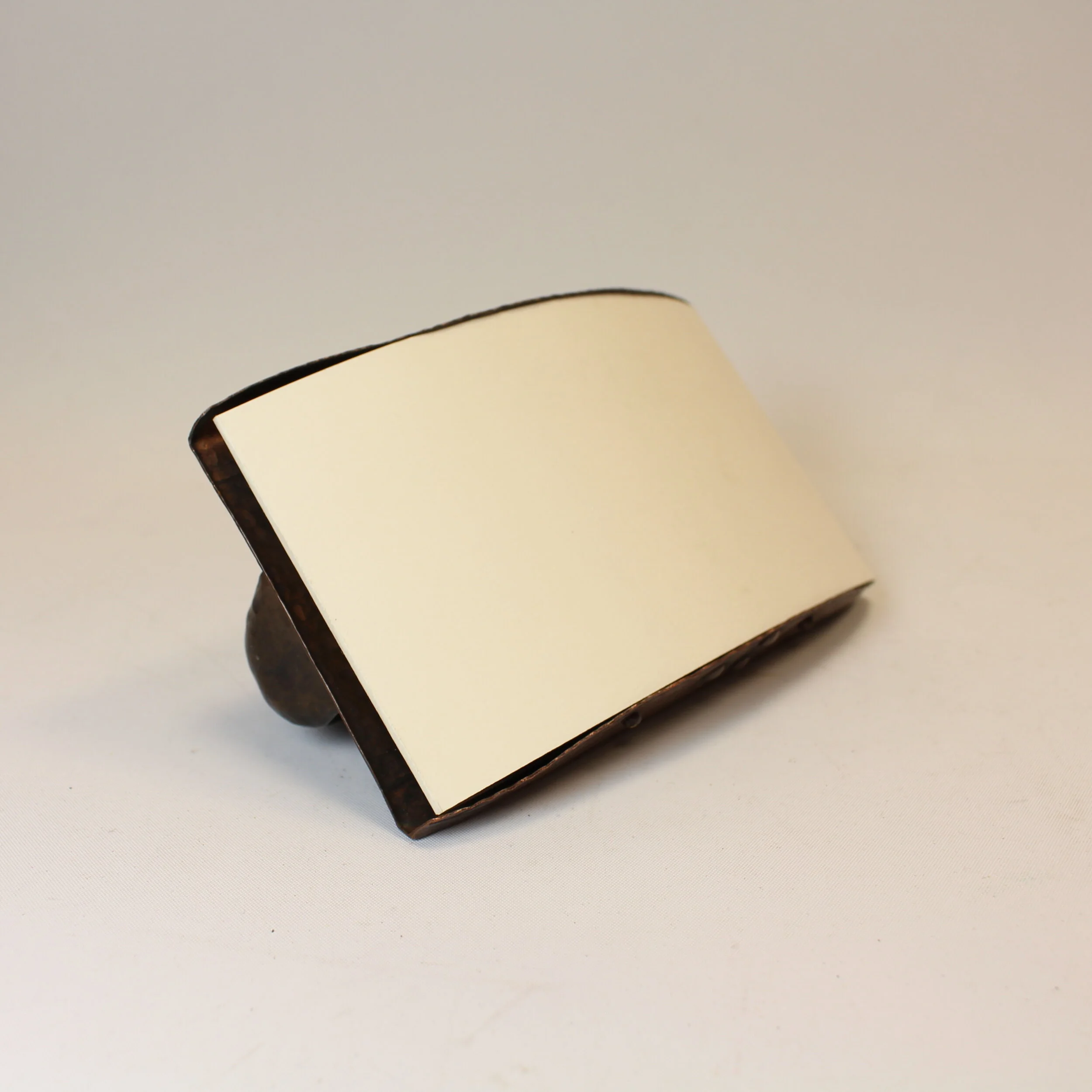 Extraordinary hand hammered copper ink blotter with brass rivets and hand formed repousse handle with D-shaped cutouts. Exceptional original reddish-brown patina and finish with original oak block/insert and recently replaced paper. Numbered “15” in pencil, otherwise unmarked. 6”l x 3.5”w x 2.75”h. $495.