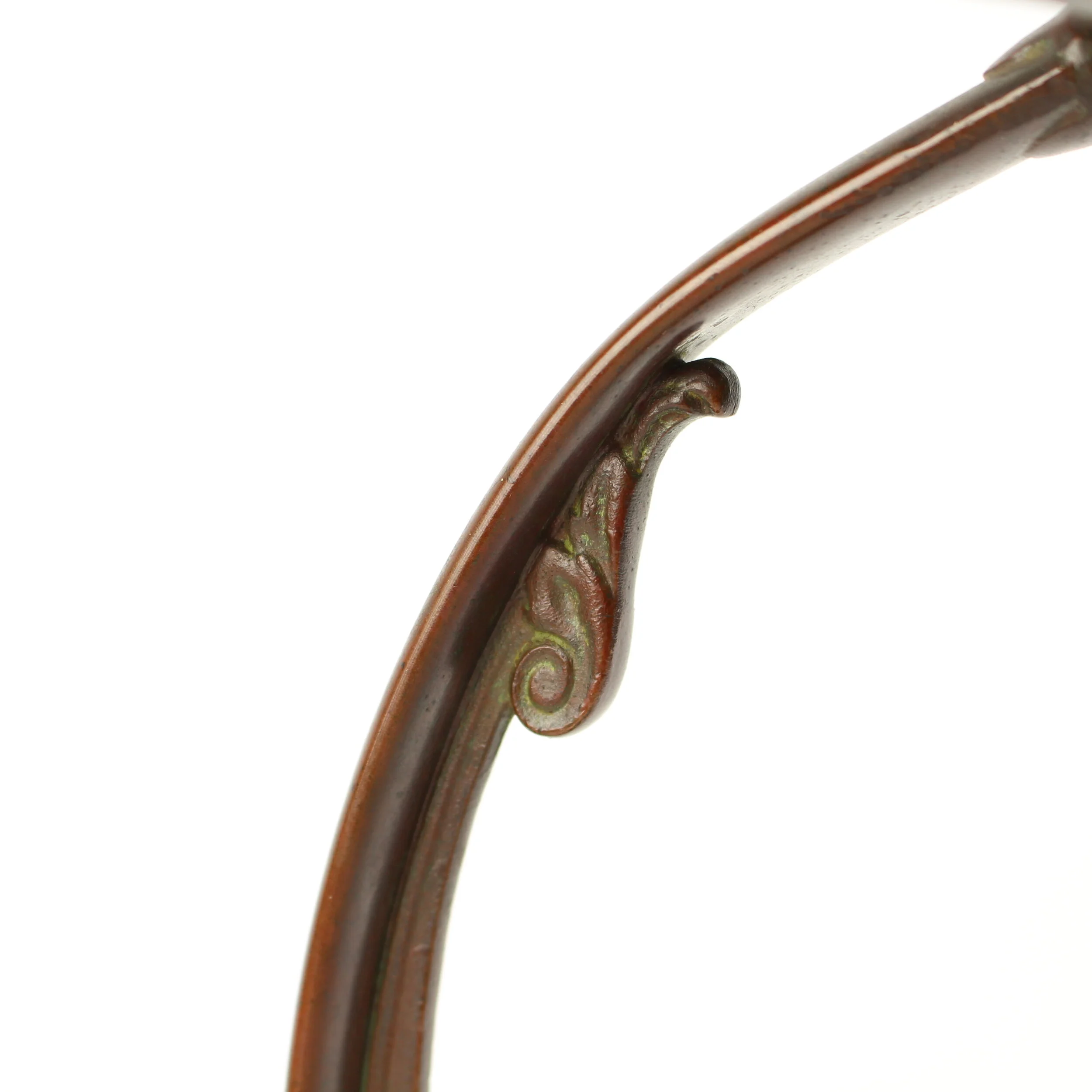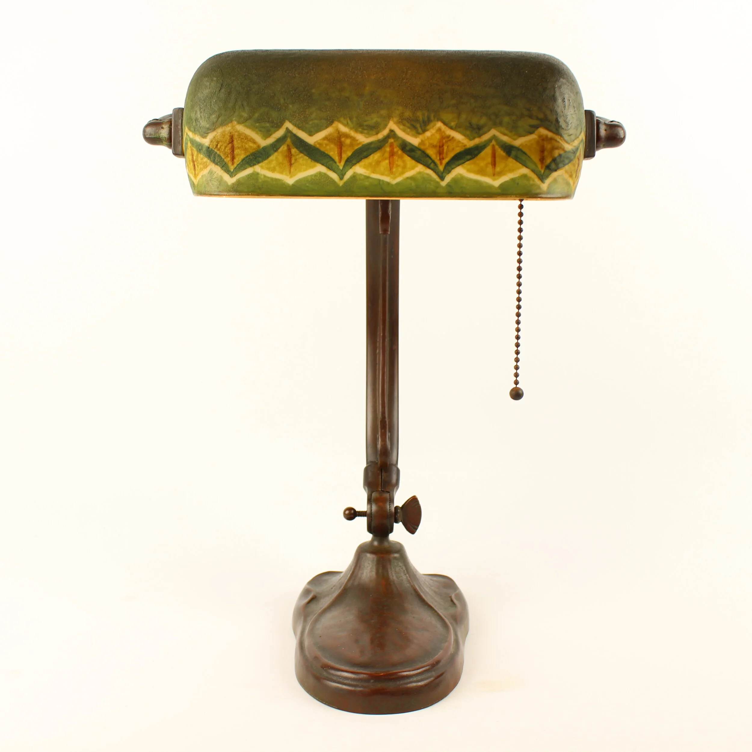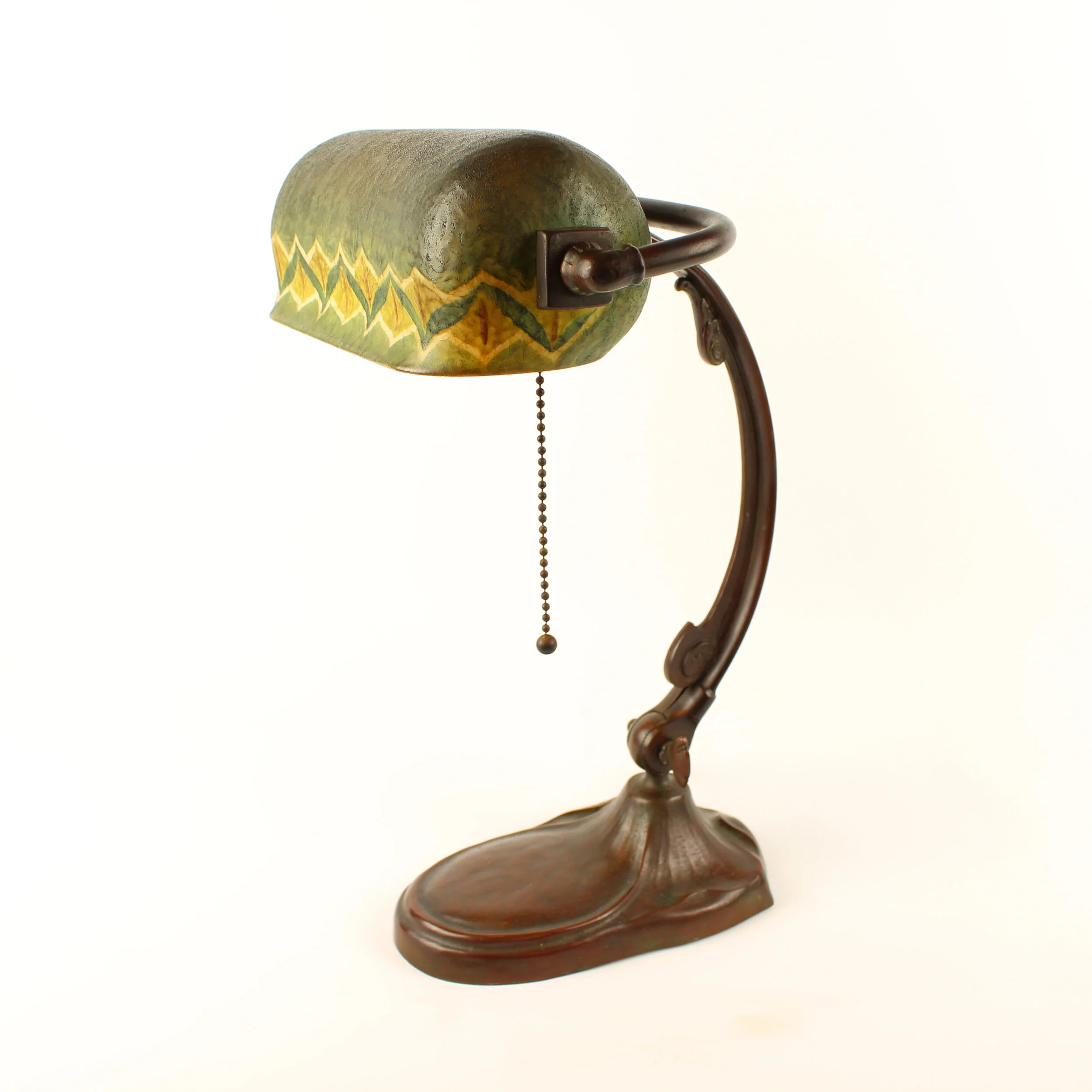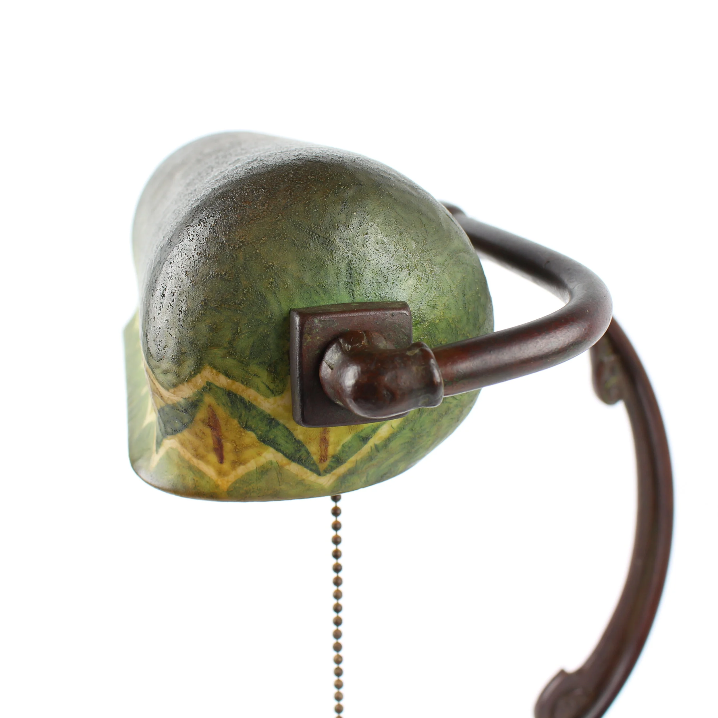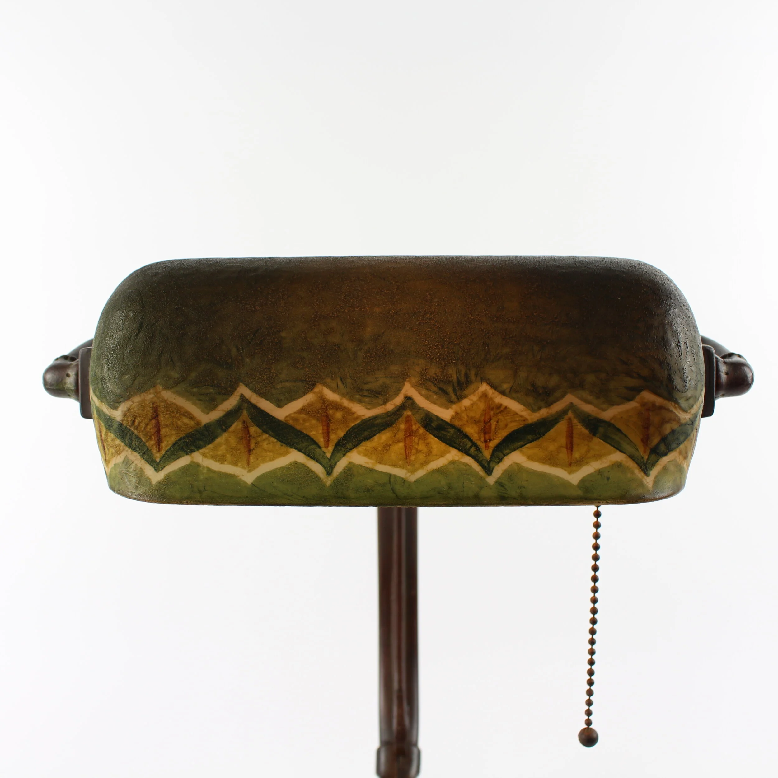 Fantastic original Handel adjustable piano lamp no 6371 with 8” cylindrical green Mosserine shade decorated with stylized leaves and vines border. Incredible original patina and condition with no cracks or damage. Rewired with appropriate cloth covered cord. Double signed and numbered. 14.25”h x 10.25”w. SOLD