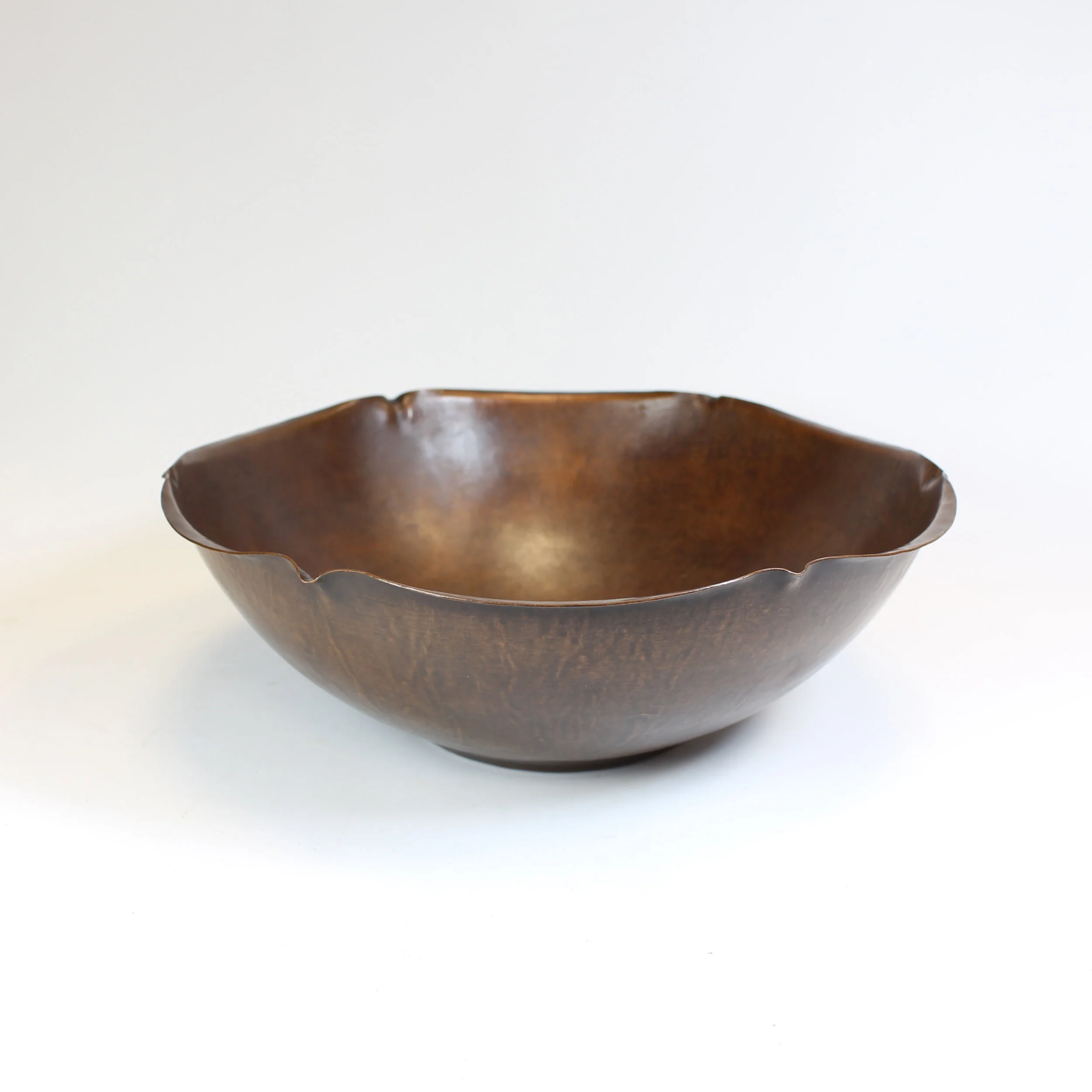 Harry St. John Dixon hand hammered copper fruit bowl with crimped rim and unusual veiny planished finish. This outer surface of this bowl was very skillfully executed, and has a wonderful natural and organic presence. Signed with impressed San Francisco shop mark. Beautifully repatinated years ago. 10”d x 3.5”h. SOLD