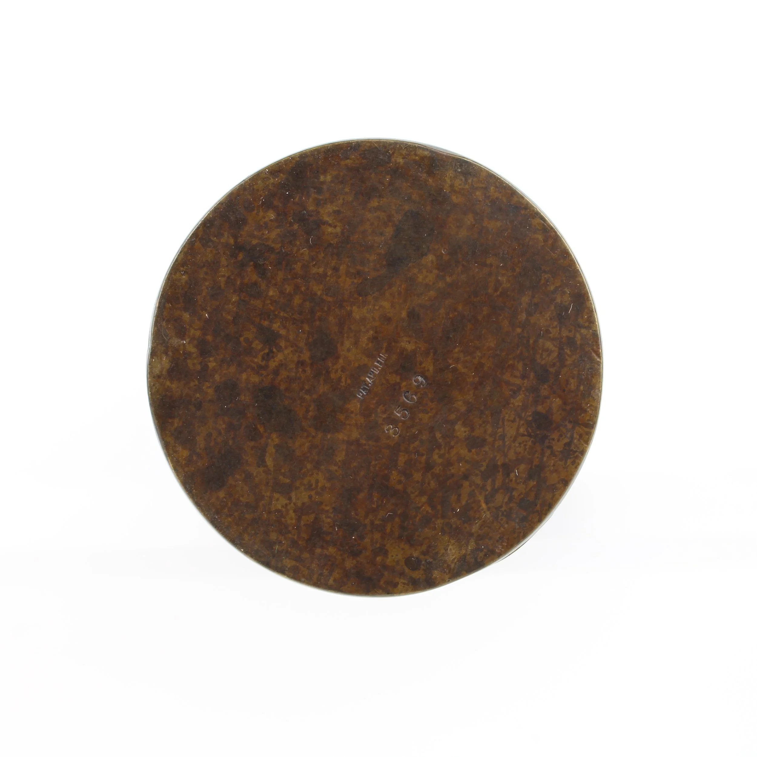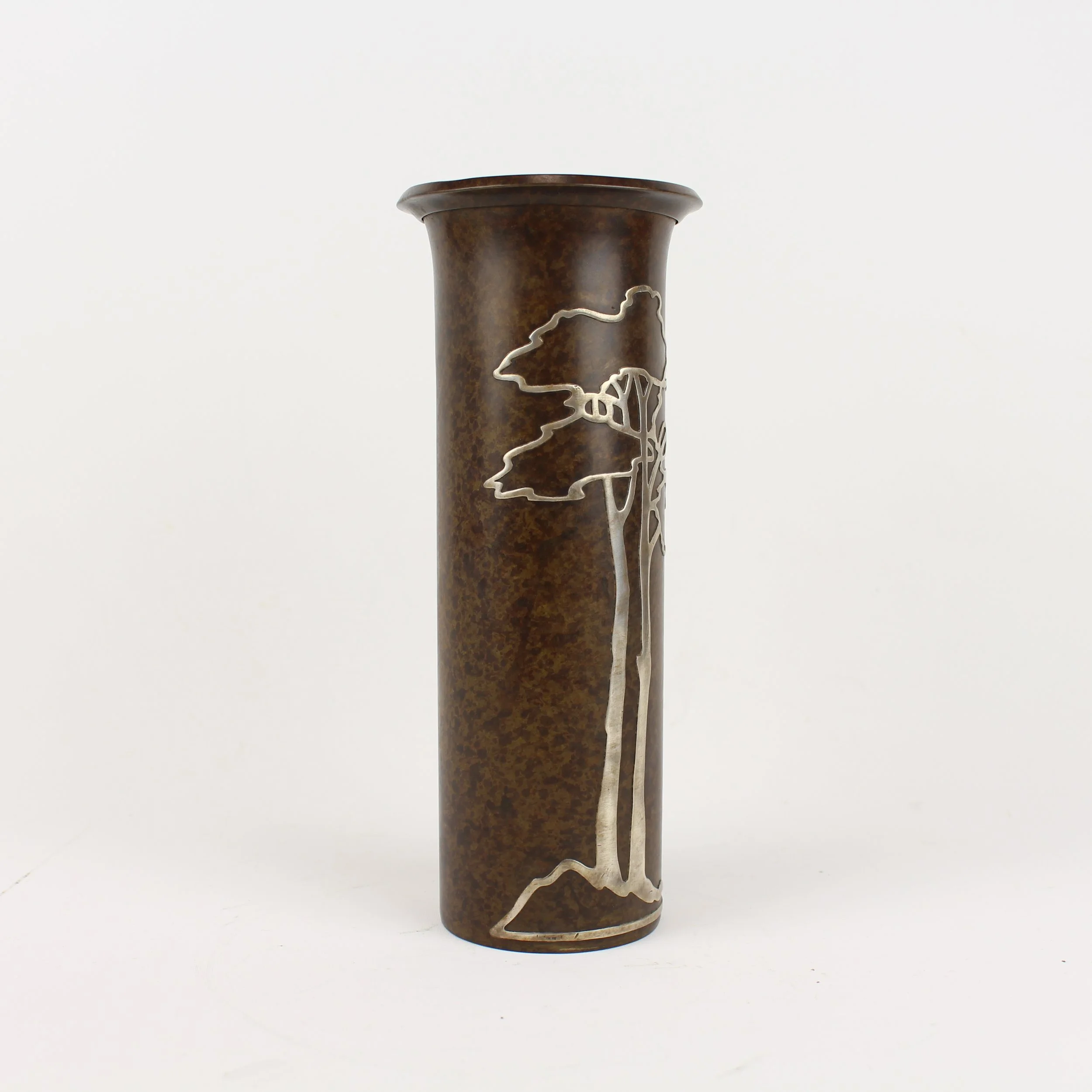 Heintz Art Metal Shops arts and crafts flared bronze cylinder vase decorated with stylized trees and landscape in sterling silver overlay. This is one of our absolute favorite motifs designed by the Heintz Art Metal Shops! Excellent condition with a beautiful mottled brown patina. Marked under base with impressed “Pat.Apd.For” and numbered “3569”. Also marked “Sterling” in the lower portion of the silver overlay. Buffalo, New York. Circa 1911. 8”h x 3.25”w. SOLD