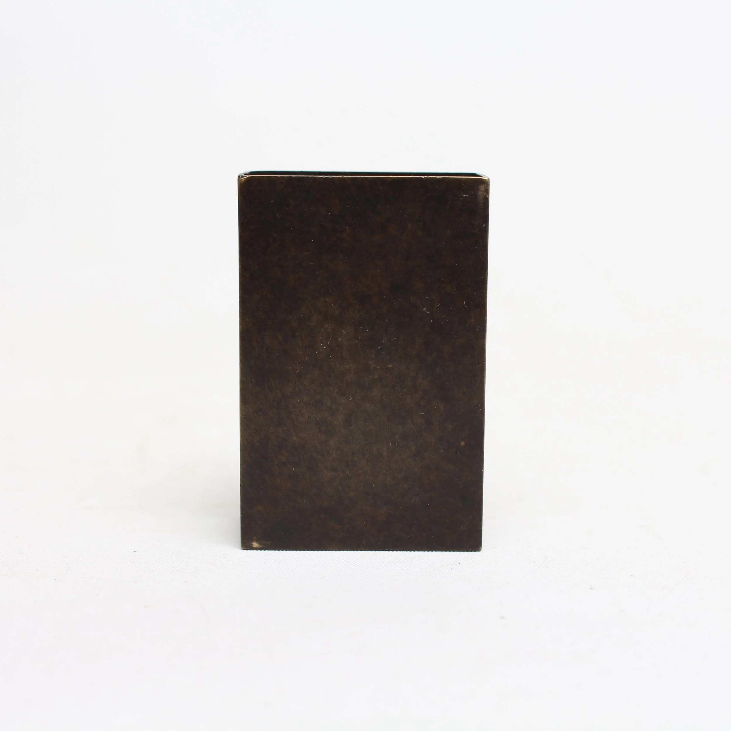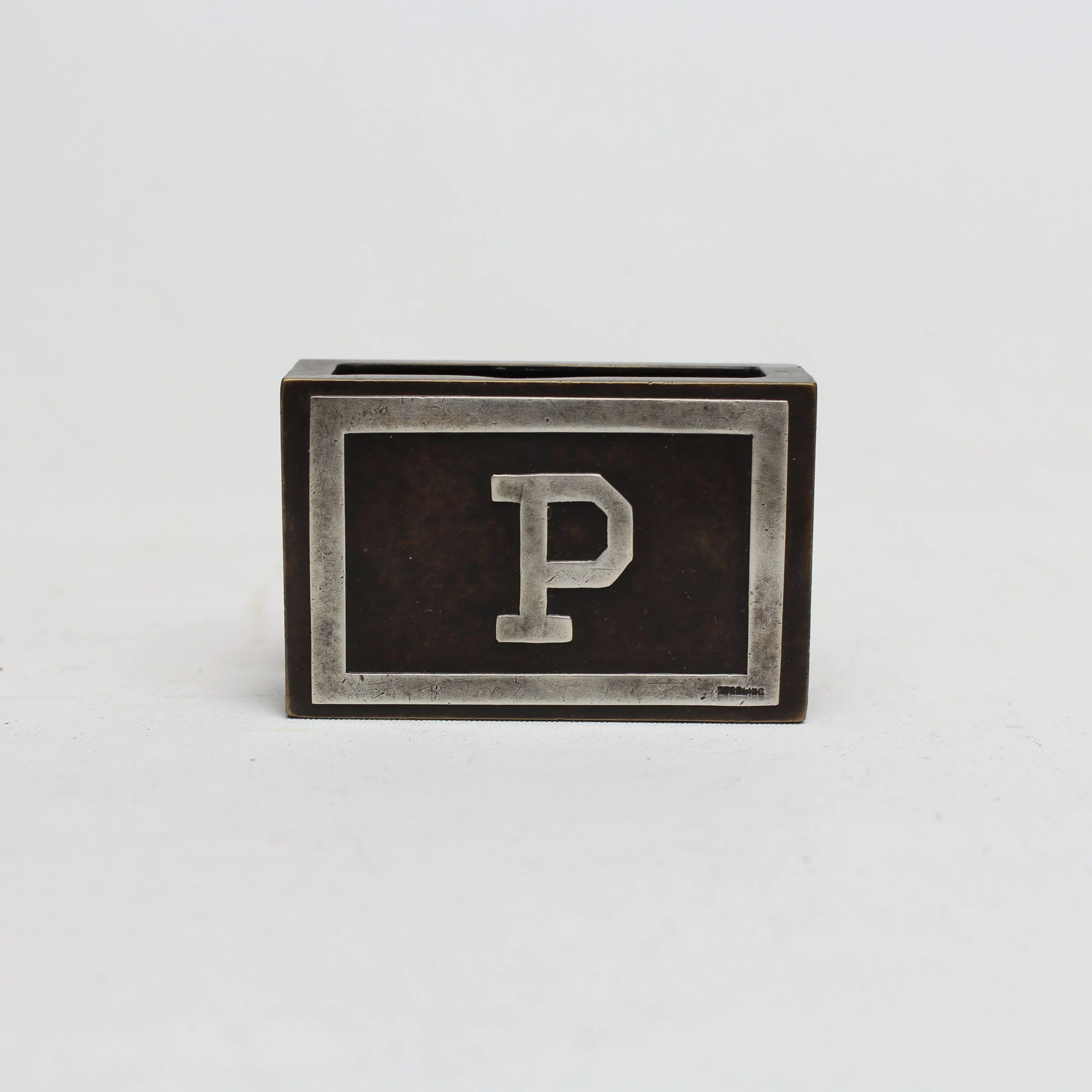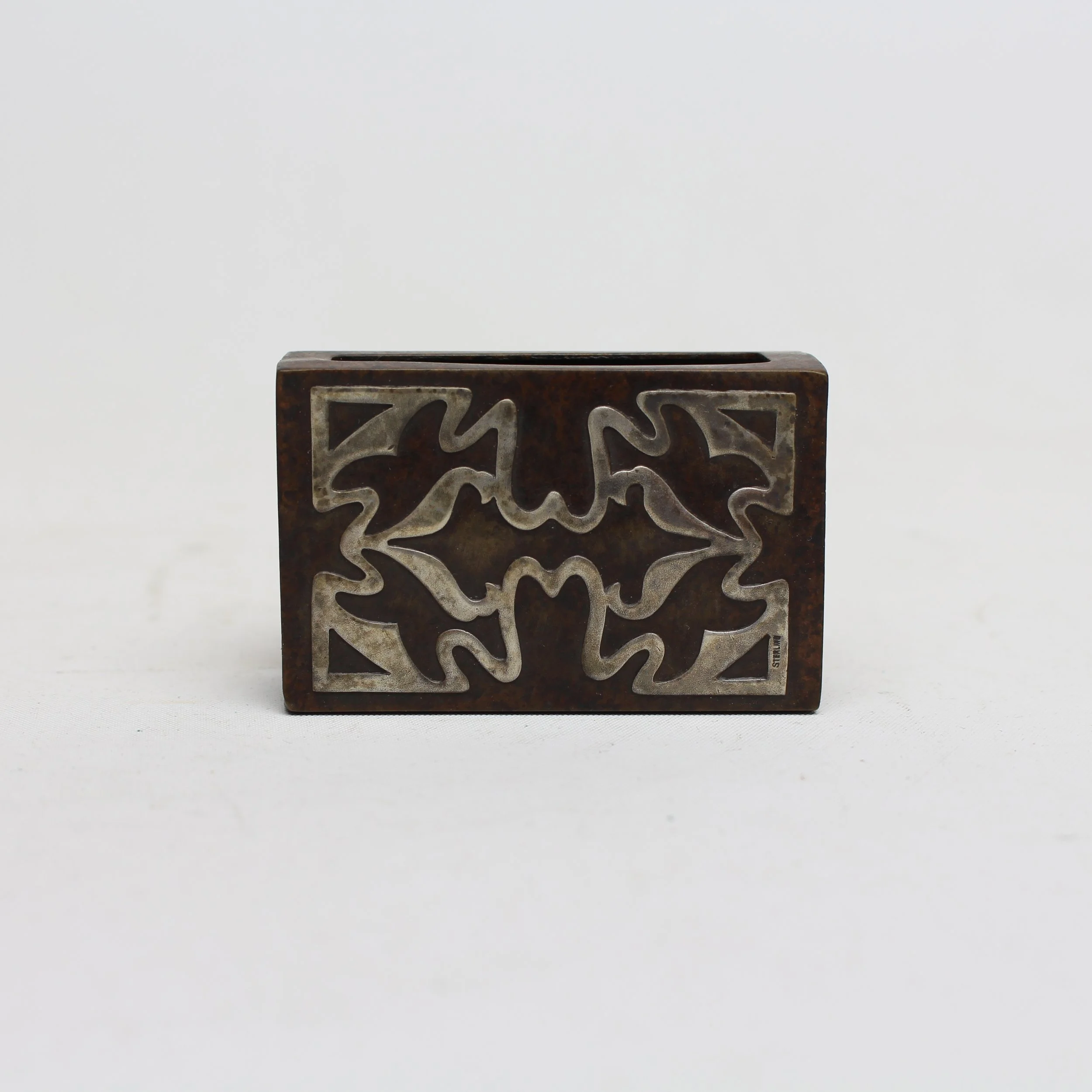 Three individual Heintz Art Metal Shops matchbox covers in bronze with sterling silver overlays. Marks (as pictured, left to right) #1 unmarked, #2 marked “Sterling” on overlay, #3 marked “Pat.Apd.For” and numbered “4716” on reverse with “Sterling” on overlay. Buffalo, New York. Circa 1908-1912. 2-3/8”l x 1.5”w x 3/4”h. Each, $145. (#2 “P” Sold).