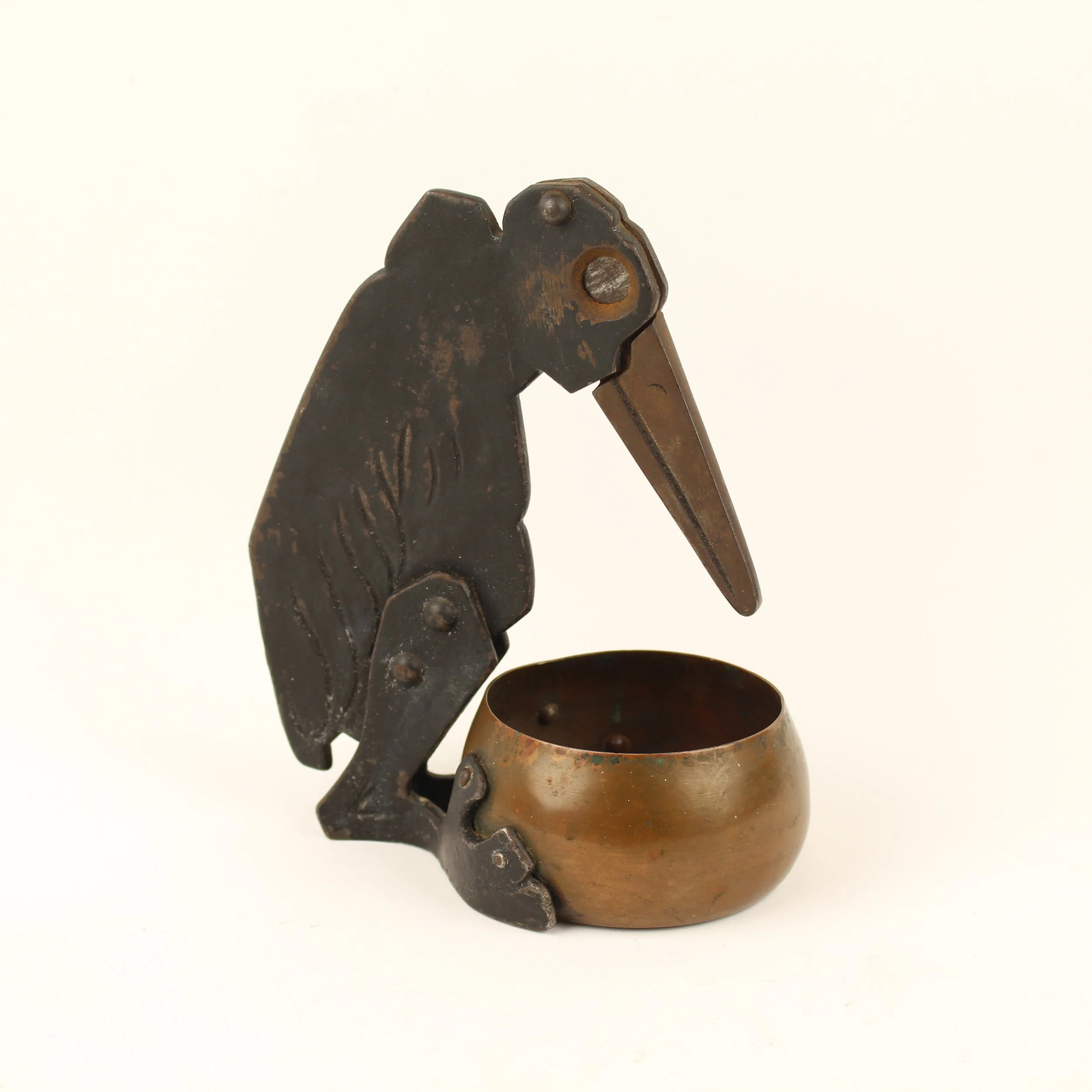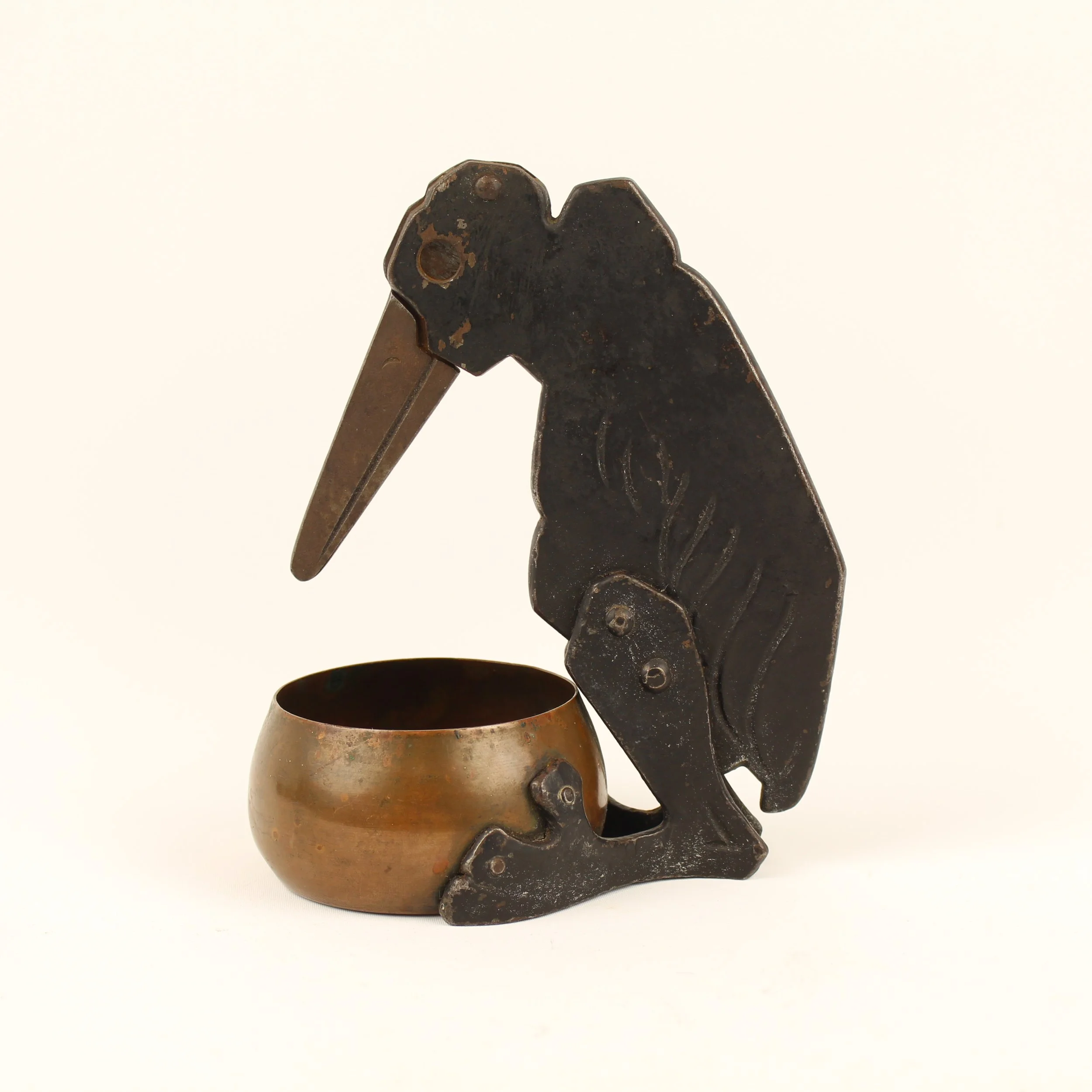 Ignatius Taschner mixed metal (copper and iron) Jugendstil marabou stork cigar cutter. The bird’s beak lifts up to cut the cigar tip through the eye. Very good original patina and finish throughout. Unmarked. Germany. Circa 1900. 6.25”h x 5”w. $395.