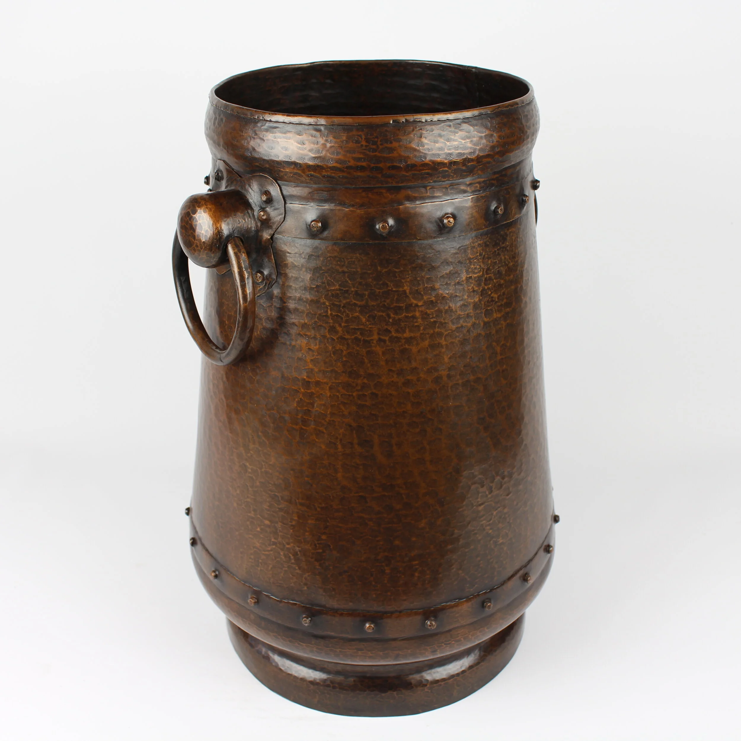 Large Arts & Crafts hammered copper two-handled floor vase with excellent riveted construction and reverse-tapered body. Though unmarked, this form has been attributed to Stickley Bros. in the past, and is pictured in Cincinnati Arts Galleries' “Rookwood X & Keramics 2000” catalog as part of the Seger collection. 16”h x 10.5”w x 7.25”d (opening). SOLD