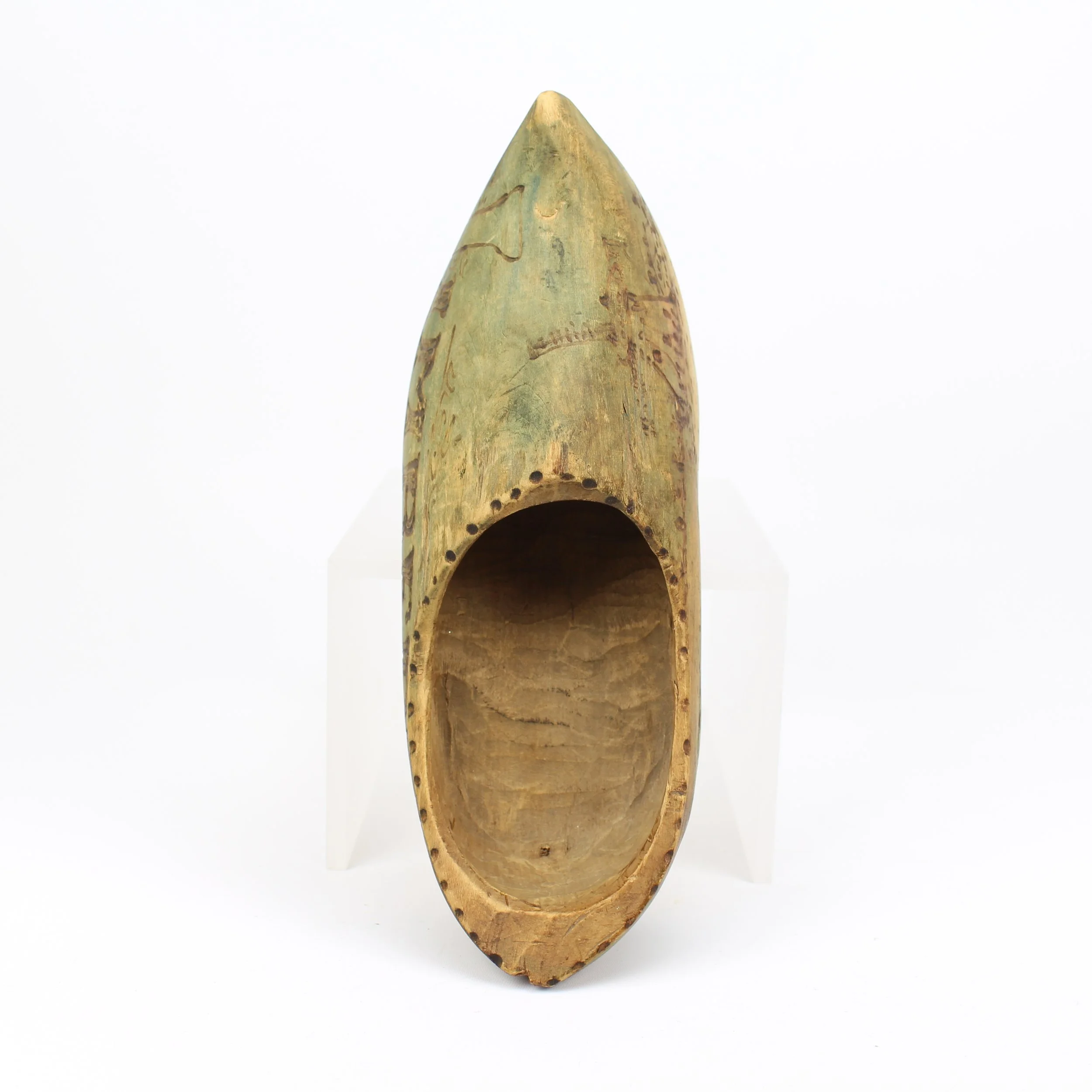 Charles P. Limbert Furniture Co., Grand Rapids/Holland, Mich., original pair of large carved wooden advertising clogs reading “Limbert’s Arts & Crafts Furniture”. Reverse side of each clog is marked “Limbert”, hand decorated in pyrography. One having a windmill motif, and the other a lighthouse. Wonderful original green finish intact. These are rare in any size, but typically surface in the much smaller 4” length, and more often than not, as singles. These are much larger, each measuring 10”L x 3.5”W x 4”H. SOLD