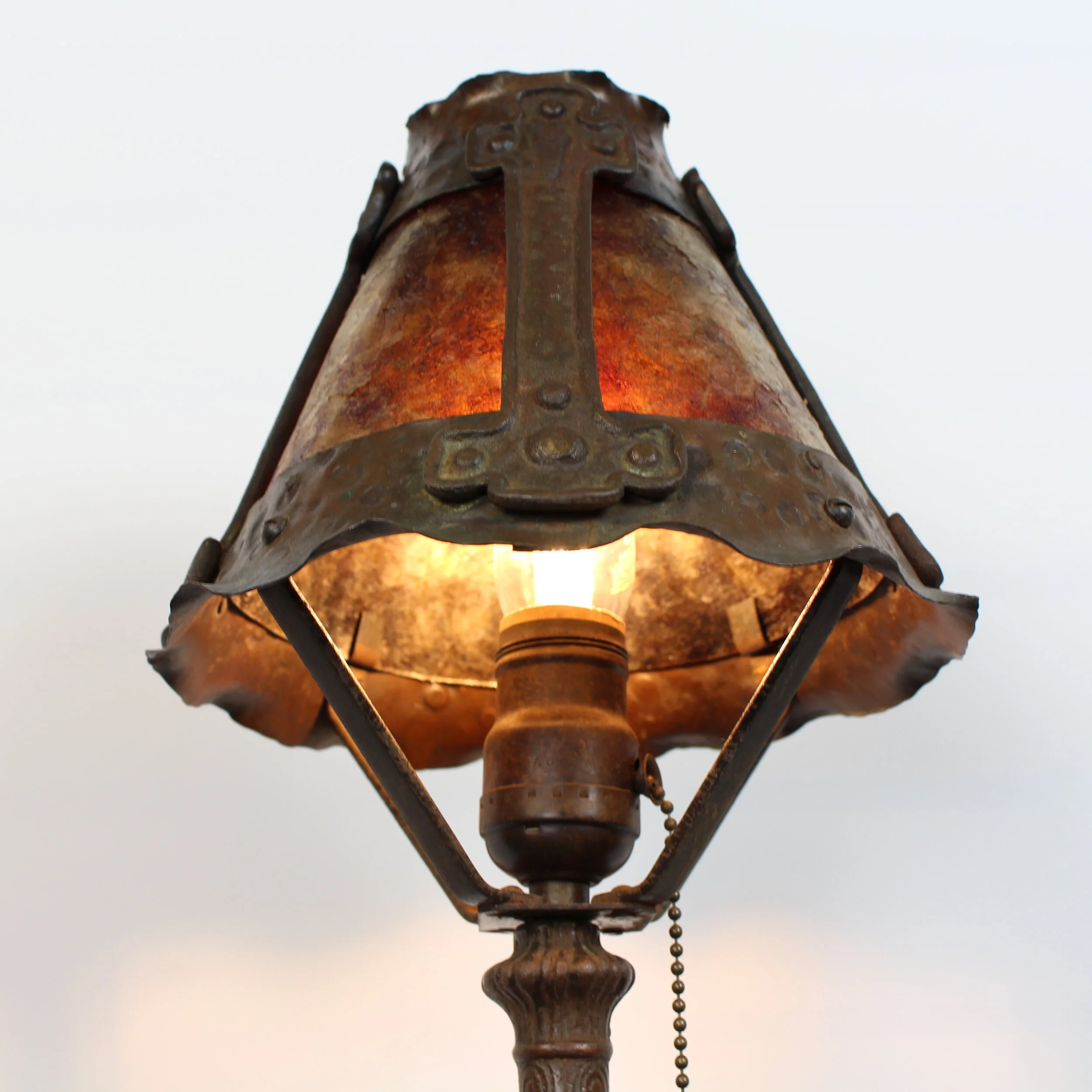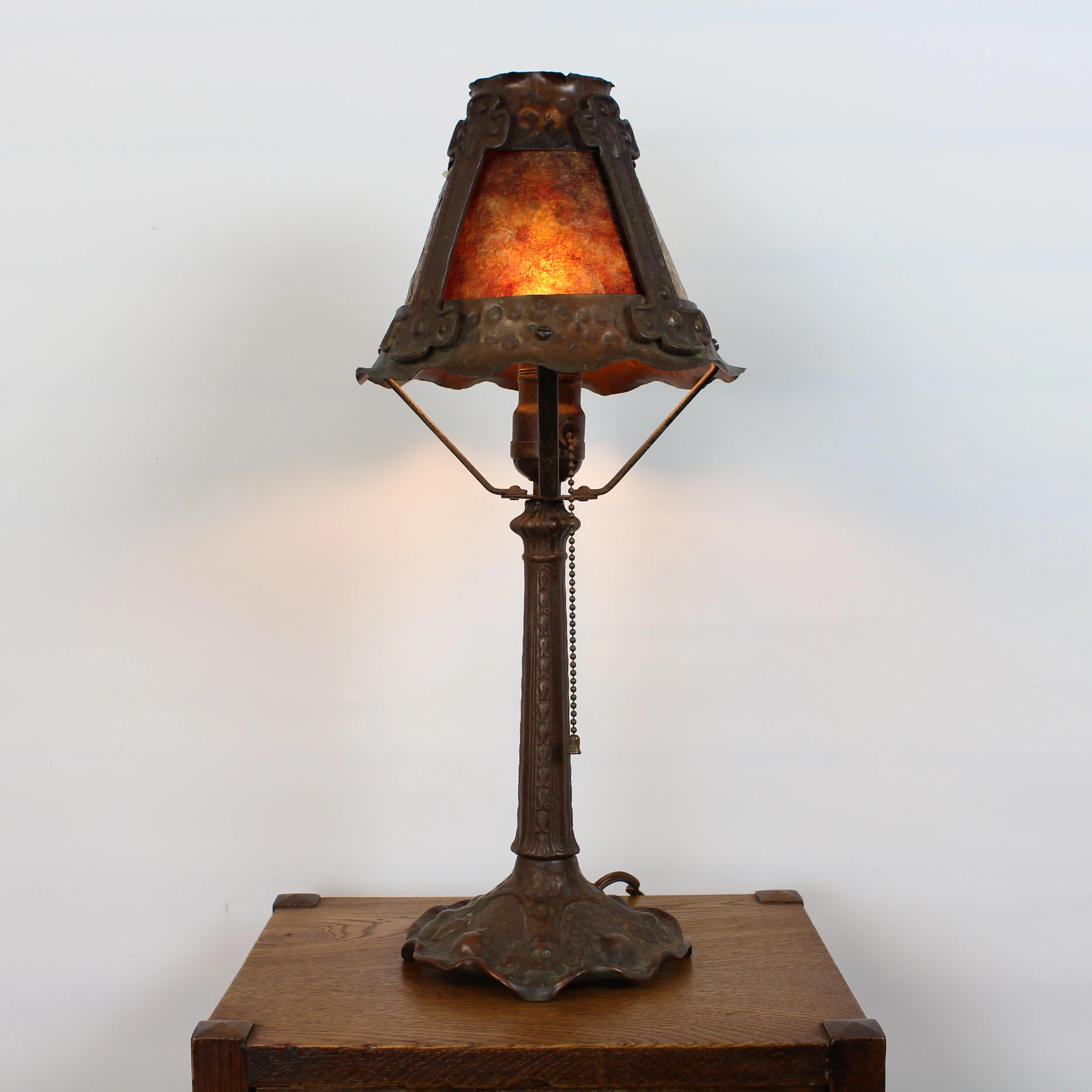 Arts & Crafts Old California Mission hammered copper and mica table lamp, circa 1920s. This lamp has great presence, and would easily compliment any Arts & Crafts, Spanish Revival or even Gothic design aesthetic. Heavy copper-bronze finished base with wonderful original color and patina. Flared wavy hammered copper-plated brass shade with newly replaced mica panels. Shaft is decorated with vertical rows of stylized bell flowers. Original period “fat boy” socket and pull-chain, updated with new internals and period style cloth-covered cord. Unmarked. 17.5”h x 8”w (shade) x 6”w (base). SOLD