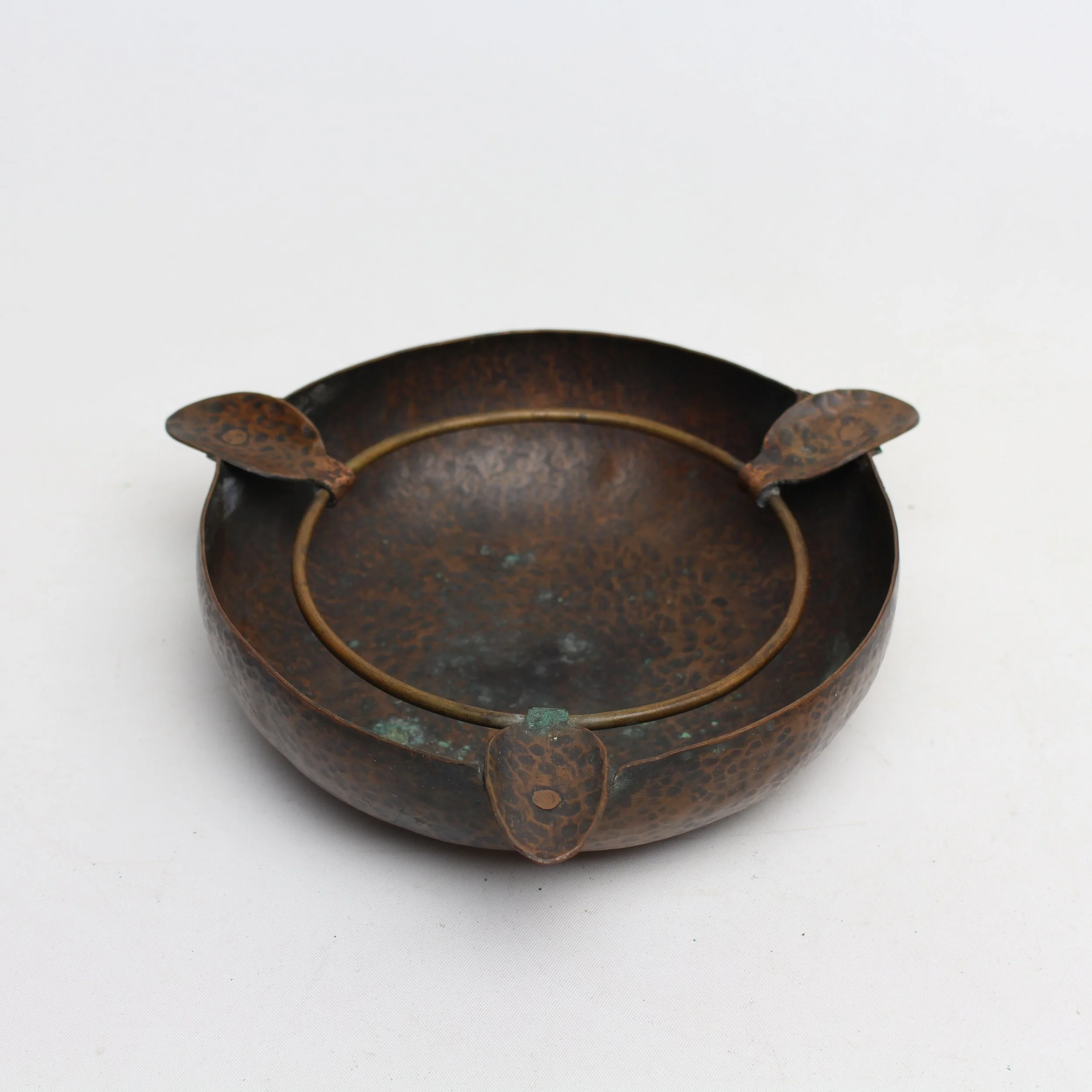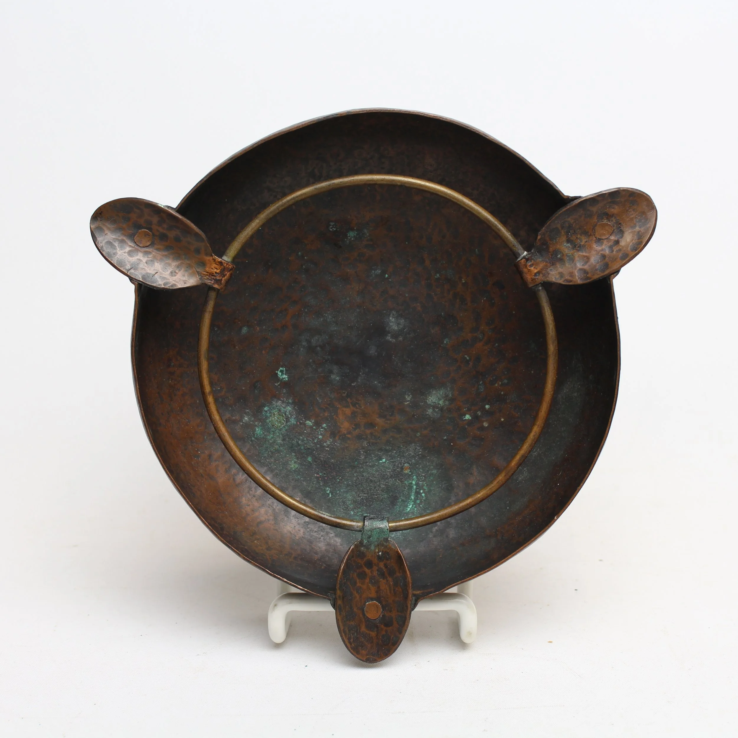 Onondaga Metal Shop hand hammered copper round ashtray with riveted construction and captive brass ring. Very cool design and execution. Would be perfect for holding a large pillar candle. Excellent original condition and patina with some minor verdigris present in the interior of the bowl. Signed with impressed conjoined “OMS” shop mark. This particular form was carried over from OMS into the Benedict shop, and is pictured in the recent Benedict Art Studios catalog reprint. East Syracuse, New York. Circa 1906-1907. 6.5”d x 1.75”h. SOLD