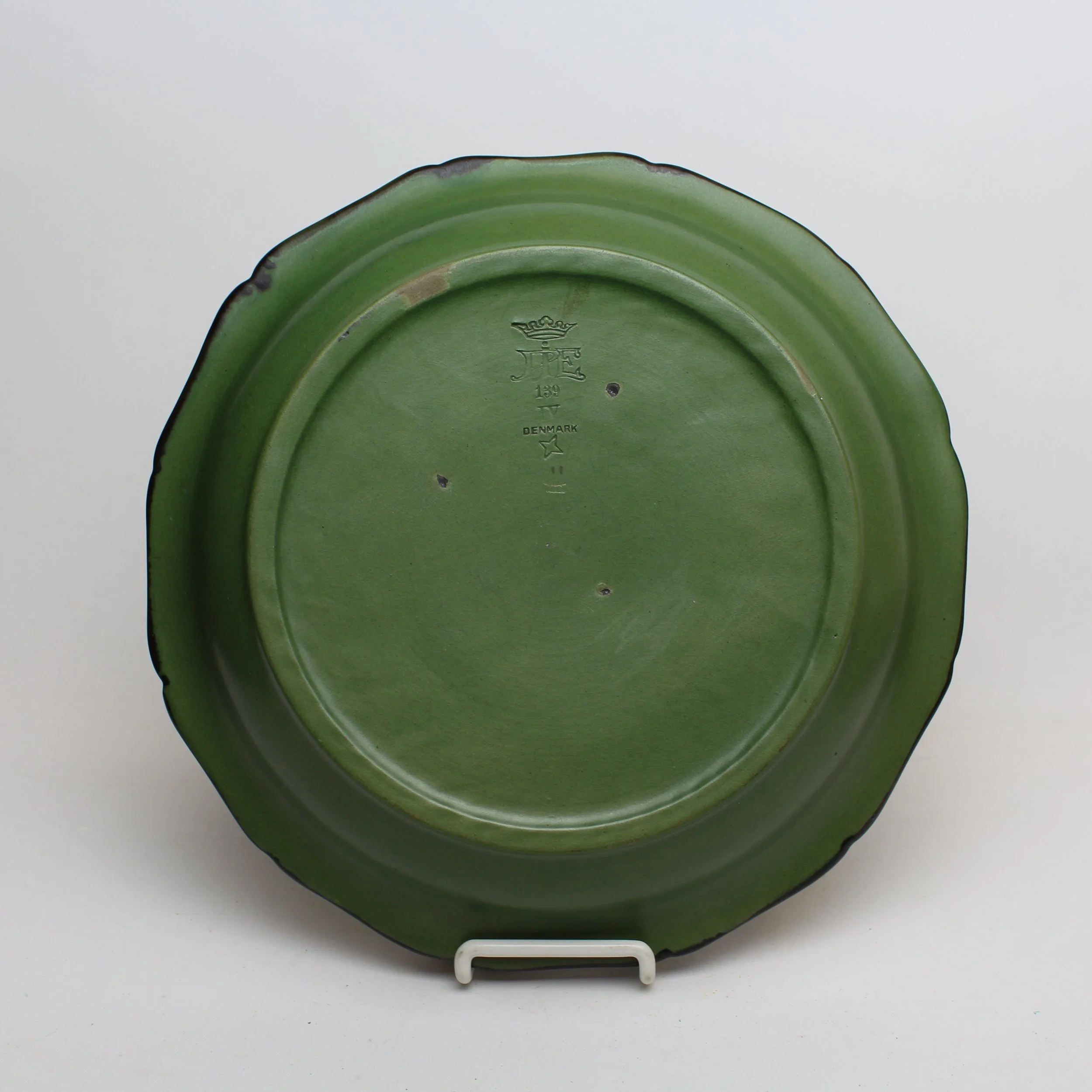 Peter Ipsen Arts & Crafts matte green pottery charger with raised koi fish and seaweed design. This is a wonderful and rare color combination for Ipsen Pottery, as their work is typically found in hues of oranges and browns. Excellent original condition with even crazing throughout as well as two very small glaze pops in bowl. Many iconic Danish potters and designers started off or worked for periods at Ipsen’s, including Axel Salto, Axel Sorensen, Georg Jensen, Just Andersen, Bode Willumsen, Arne Bang, Johannes Hedegaard just to name a few. The koi, or goldfish motif was designed by Axel Sorensen for Ipsen. Marked with impressed Crown over “PIE” (Peter Ipsen Exclusive), form number “139”, Roman numeral “IV”, “Denmark” and a 4-pointed star. Copenhagen, Denmark. Circa 1920’s. 10.75”d x 1.75”h. SOLD