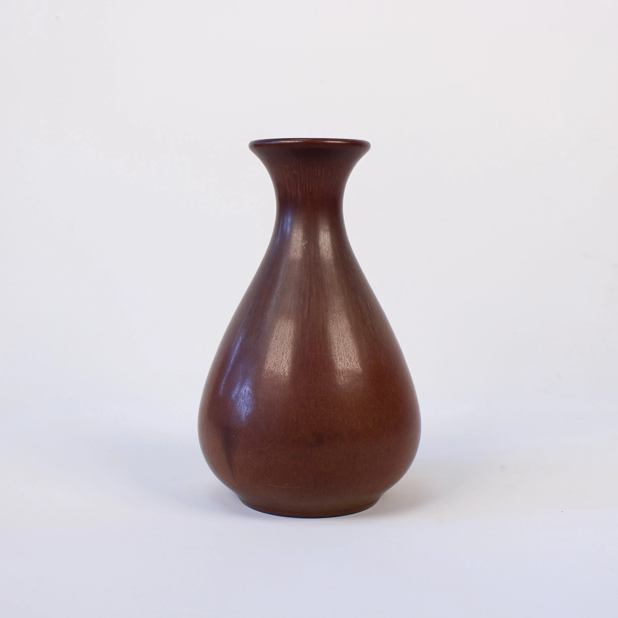 Rookwood Pottery ovoid vase with tapered neck and flared rim. Finished in a wonderful variegated plum to burnt yellow-brown matte glaze. This is an early form that is more commonly seen in the standard glaze. Excellent original condition with no damage or restoration. Marked under base with impressed shape no. “848”, Rookwood “RP” flame-mark and dated “XI” (1911). Cincinnati, Ohio. 7”h x 4.5”d. $495.