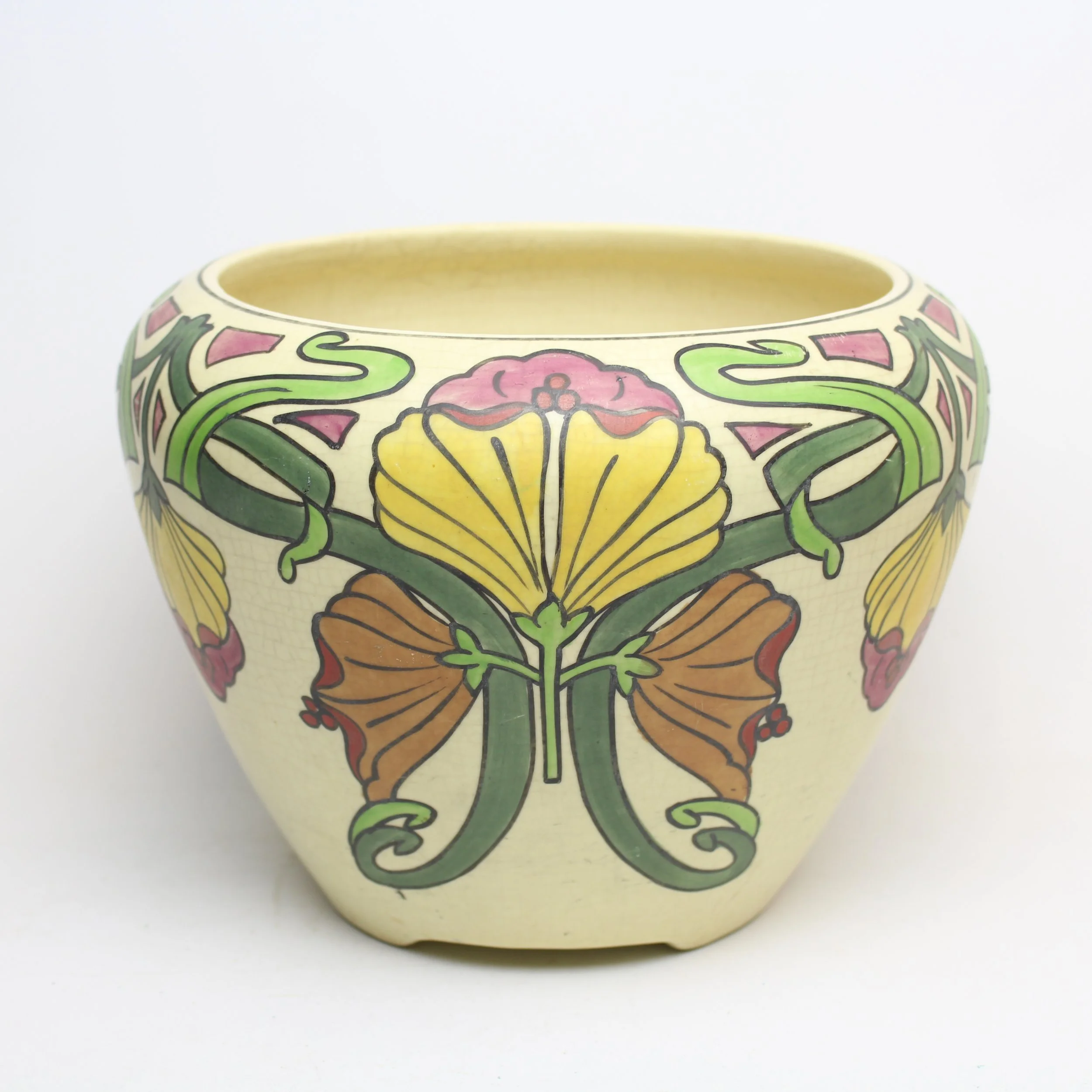 Roseville Pottery “Persian” Art Nouveau jardiniere with a wreath of hand painted hibiscus flowers. Very nice original condition with crazing throughout and one hairline crack at rim, approx 2.5” long. Unmarked. Roseville, Ohio. Circa 1905. 6.75”h x 8.75”d (opening 6.75”d). SOLD
