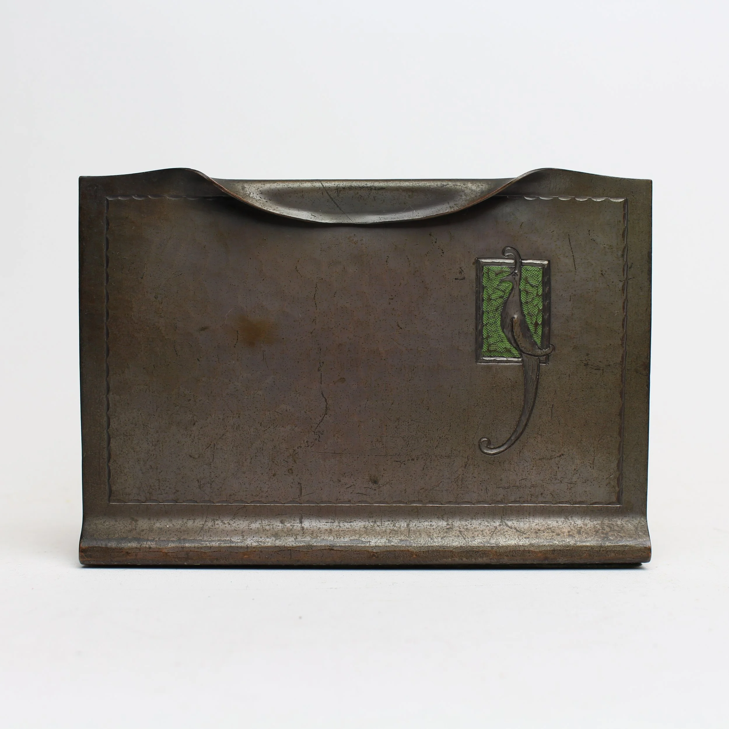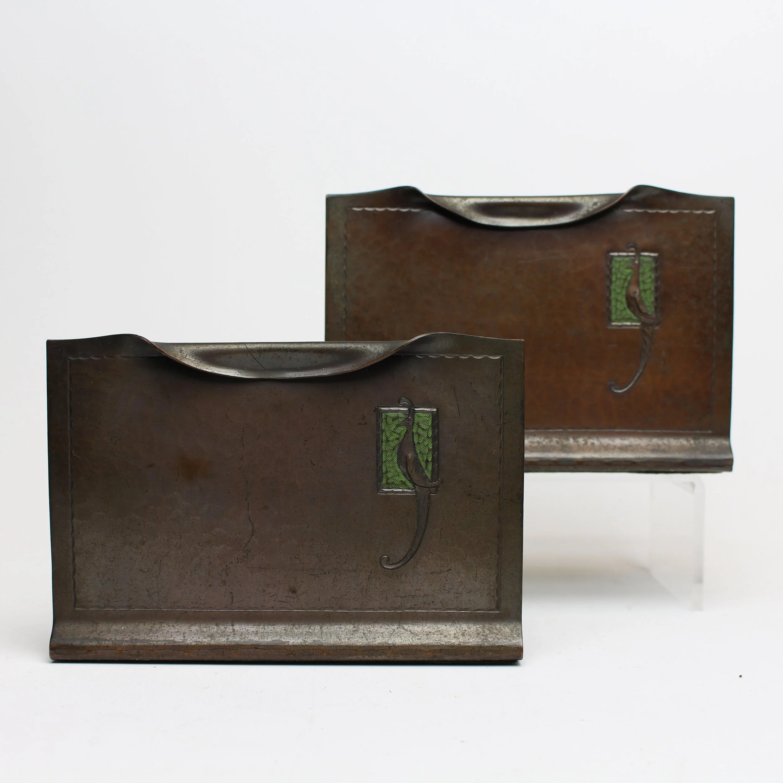 Roycroft hammered copper bookends with hand tooled and repousse bird of paradise design. Original Aurora brown patina and green polychrome background. Light surface wear, but overall a very nice example of these rare bookends. Each signed with large early impressed orb and cross mark. East Aurora, New York. Circa 1910’s. 6”w x 4.25”h x 3.5”d. SOLD