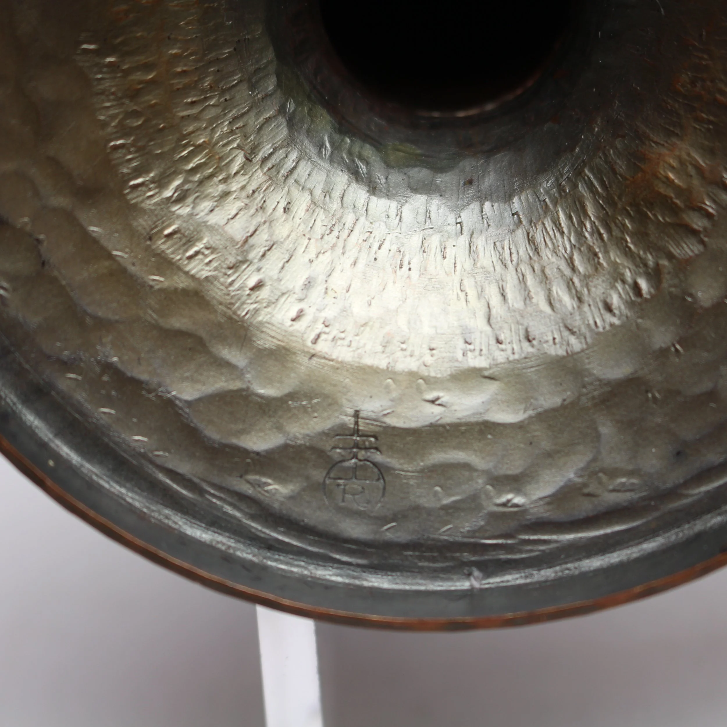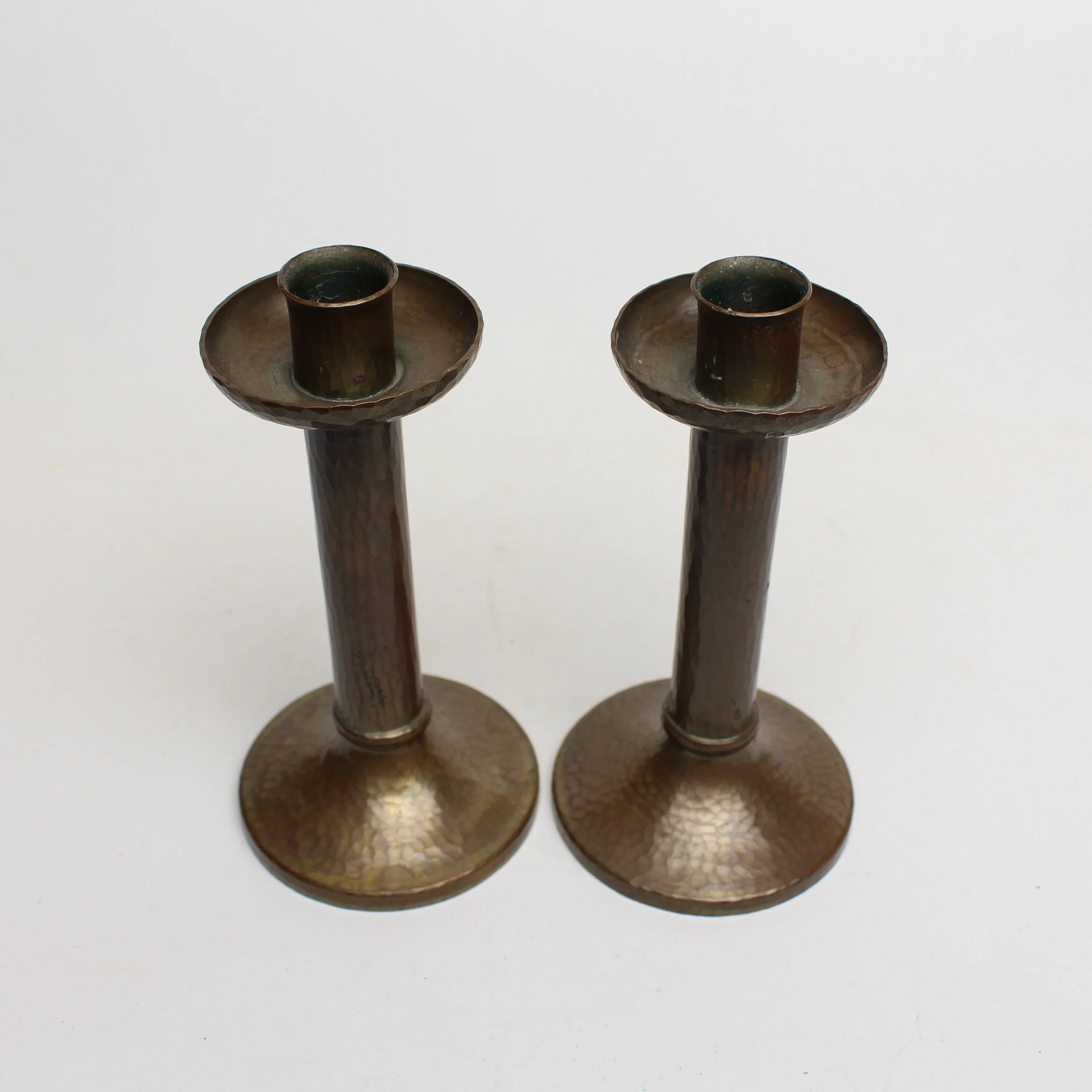 Roycroft hand hammered copper candlesticks with cylindrical shafts, model no. 406. Beautiful original patina. Each signed with small early impressed orb and cross mark, circa 1910’s. 6.5”h x 3.25”d. SOLD