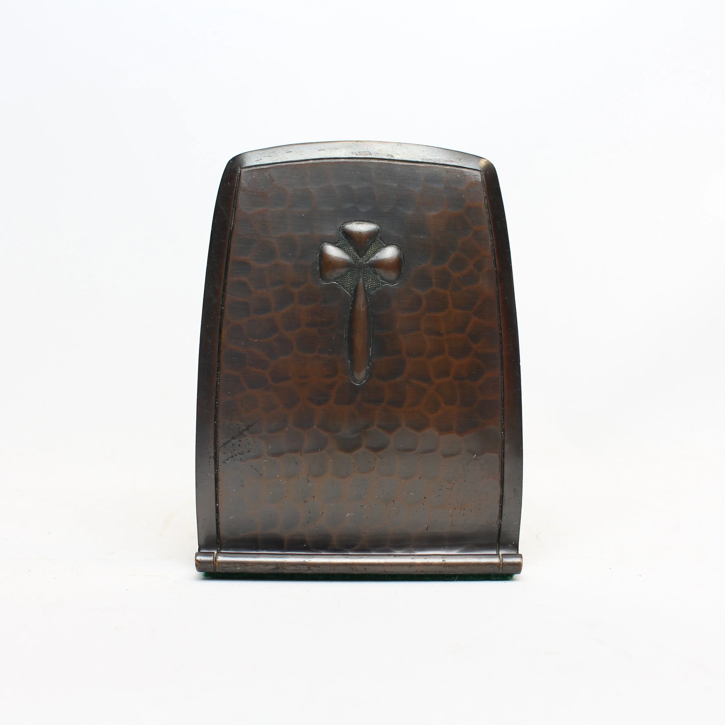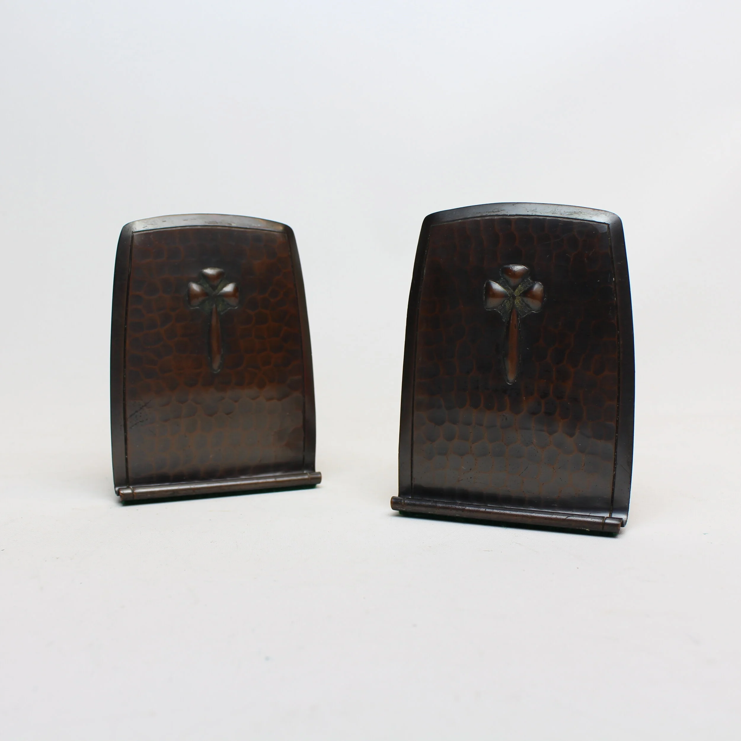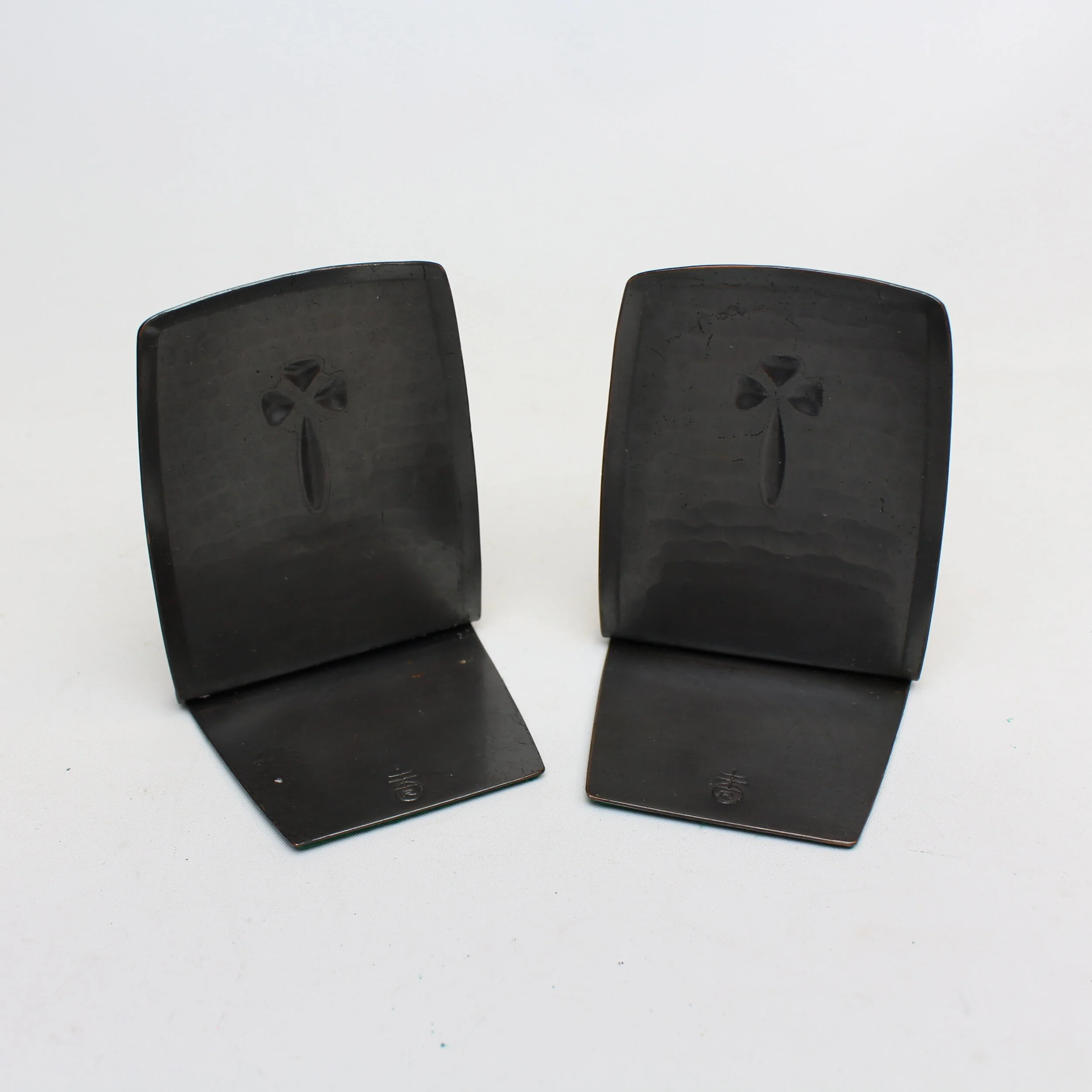Pair, Roycroft hand hammered copper bookends with tooled and repousse cross design. Excellent original Aurora brown patina. There are two different sizes of bookends with this design, these being the larger. Each signed with impressed orb and cross mark, circa 1920. East Aurora, NY. 4.25”h x 3.25”w. $395.