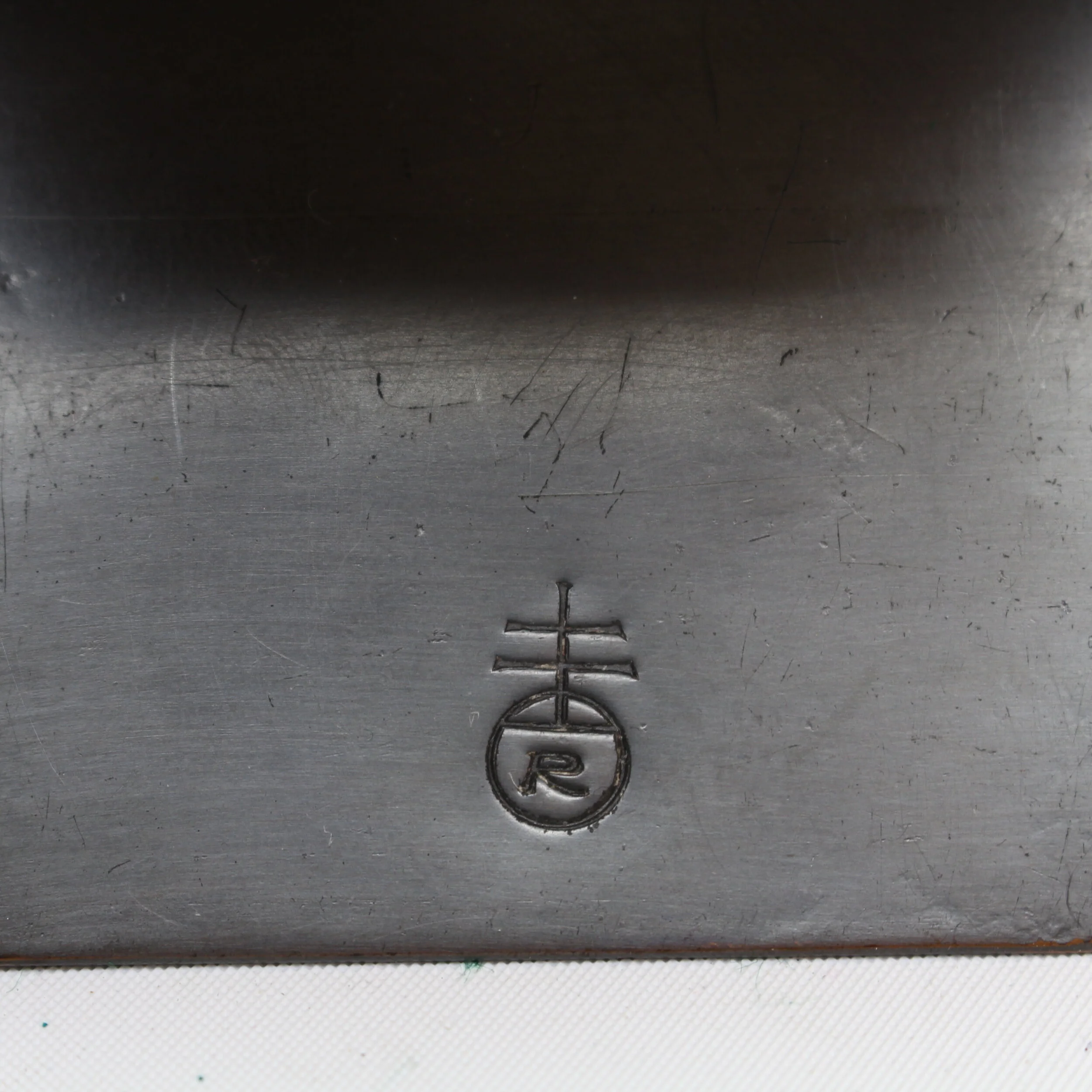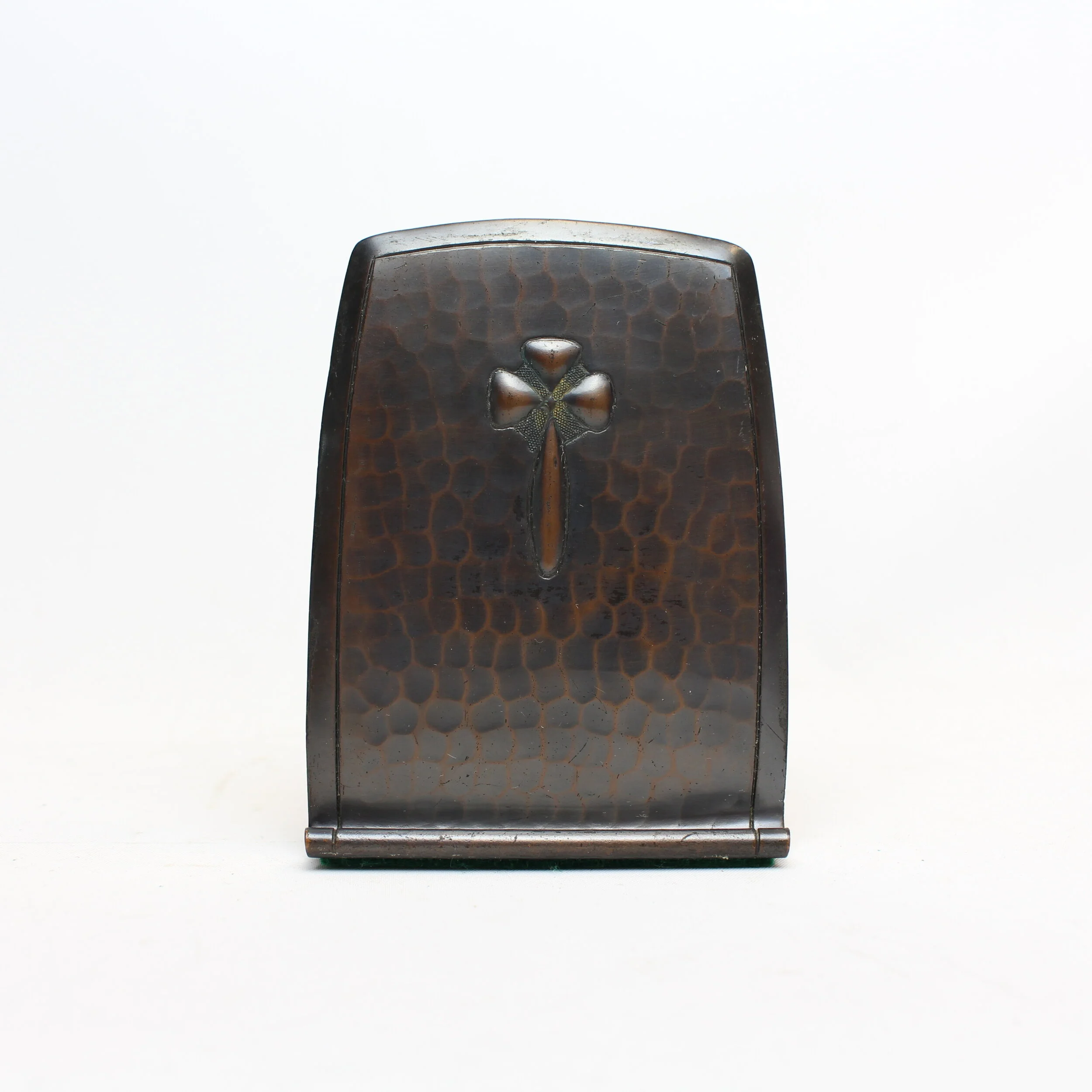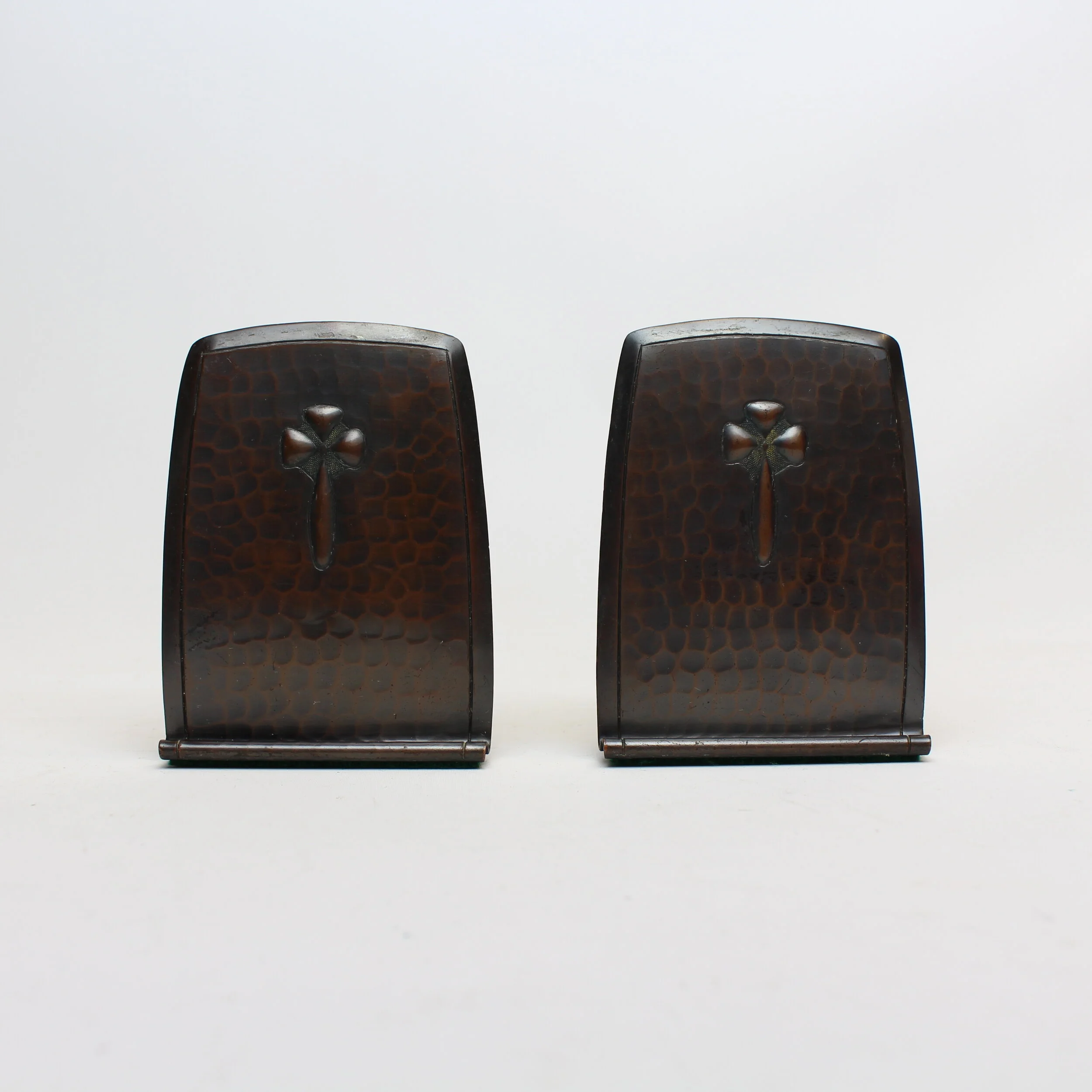Pair, Roycroft hand hammered copper bookends with tooled and repousse cross design. Excellent original Aurora brown patina. There are two different sizes of bookends with this design, these being the larger. Each signed with impressed orb and cross mark, circa 1920. East Aurora, NY. 4.25”h x 3.25”w. $395.