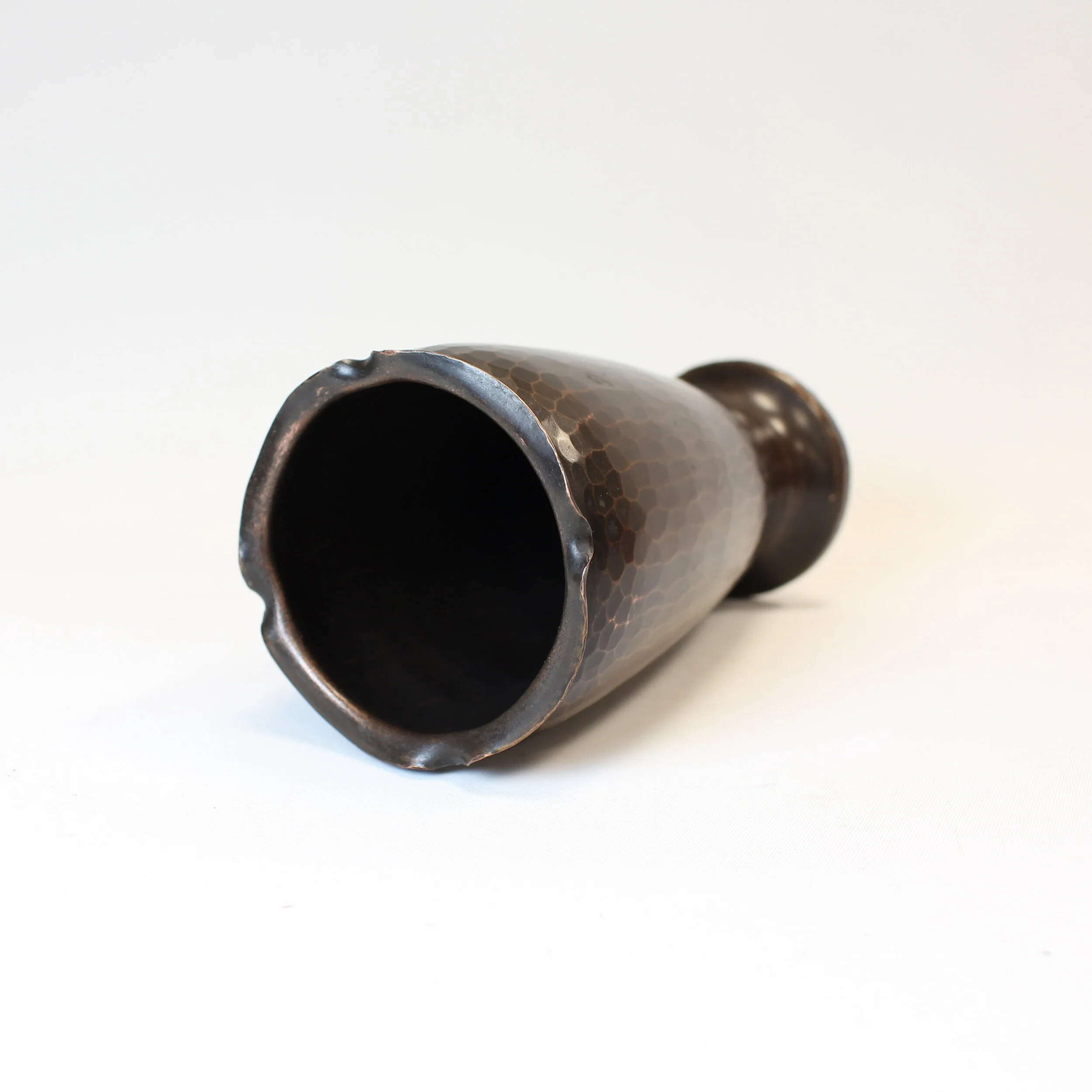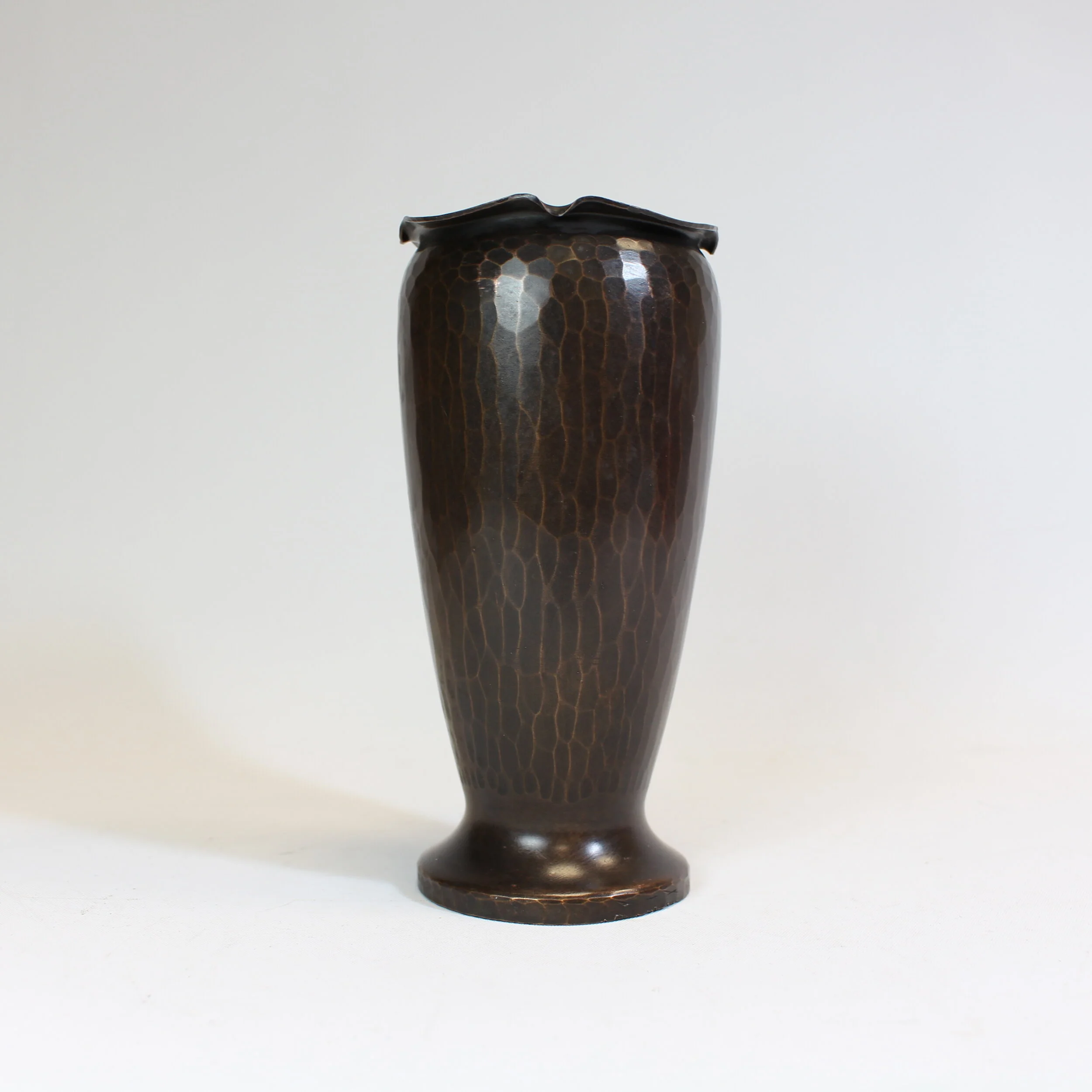Roycroft hand hammered copper footed vase with crimped “curly-top” rim. Perfectly restored “Aurora brown” patina. Signed with impressed small early orb and cross mark, circa 1910-1915. 5.5”h x 2.75”d. SOLD