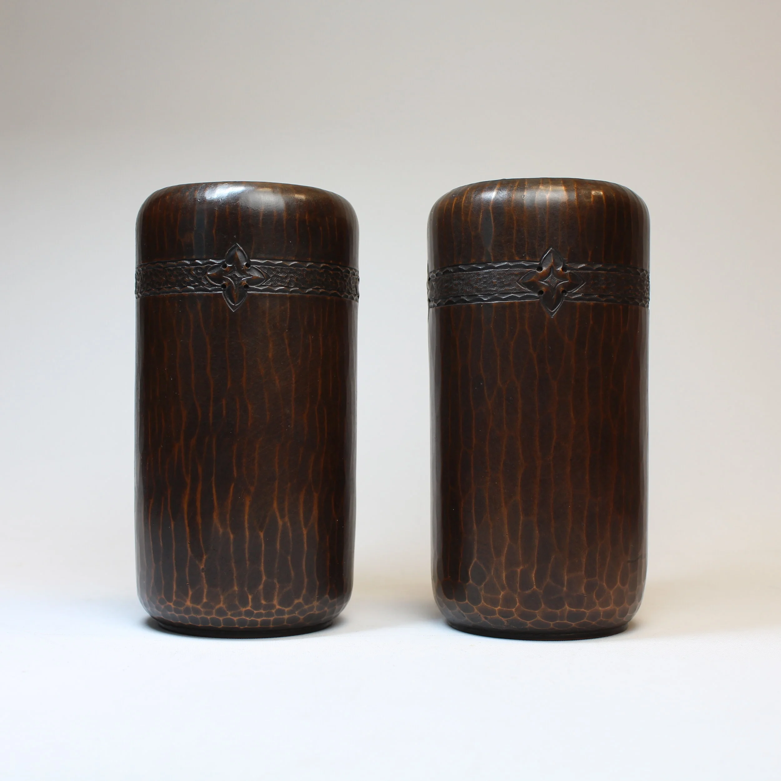 Roycroft hand hammered and tooled copper cylinder vase with stylized flowers. Beautiful new “Aurora brown” patina. Signed with orb and cross mark. East Aurora, NY, circa 1915. 5”h x 2.5”d. SOLD