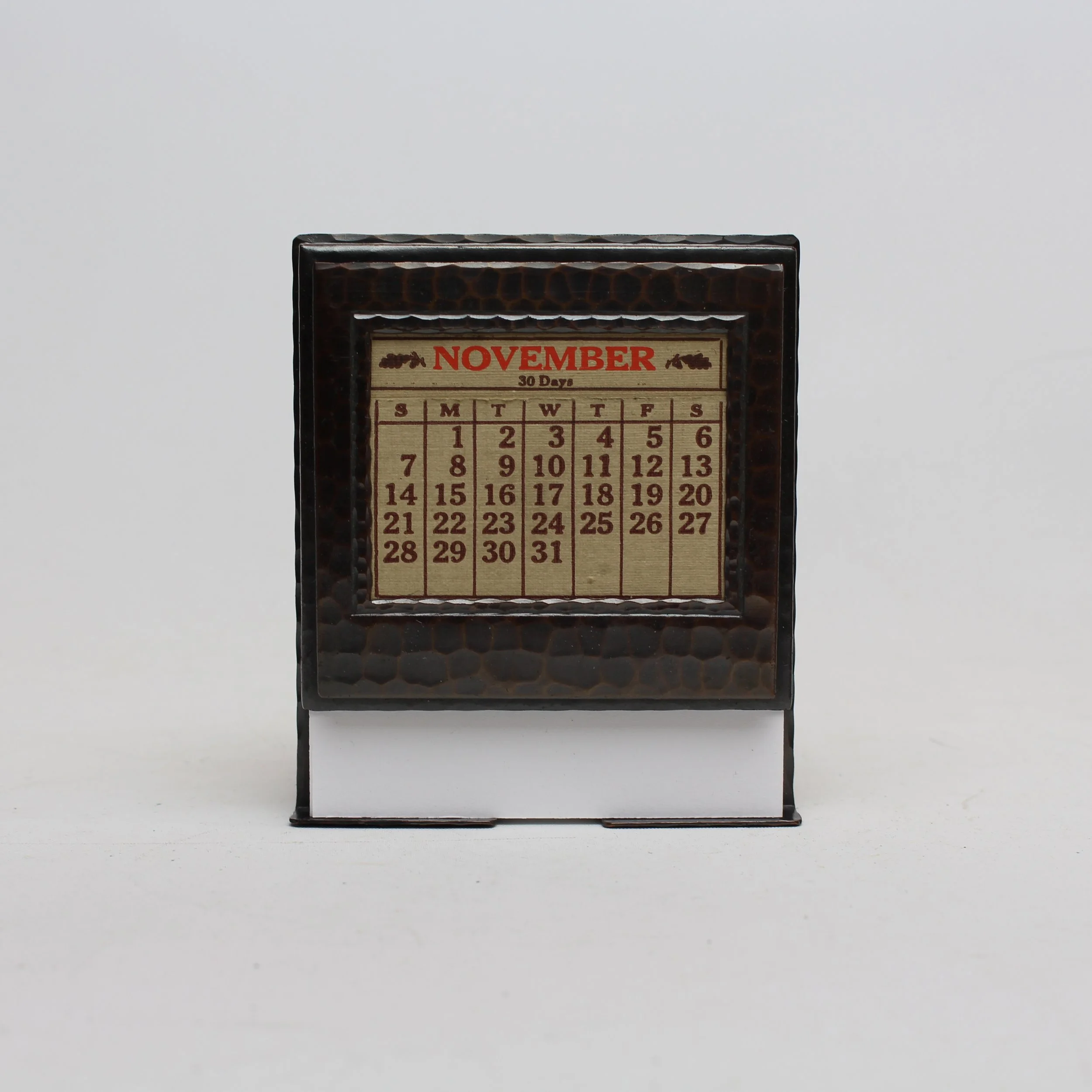 Super unusual Roycroft arts and crafts hand hammered and tooled copper 3-in-1 desk accessory, model no. 522. It’s a calendar, note paper dispenser and paperweight all wrapped up in one perfect little package! Can also be used as a picture frame. Absolutely minty original “Aurora brown” patina and condition. Includes the complete original perpetual calendar card set. Signed with impressed orb and cross mark. East Aurora, New York. Circa 1920’s. 4”l x 3.5”x. $395.