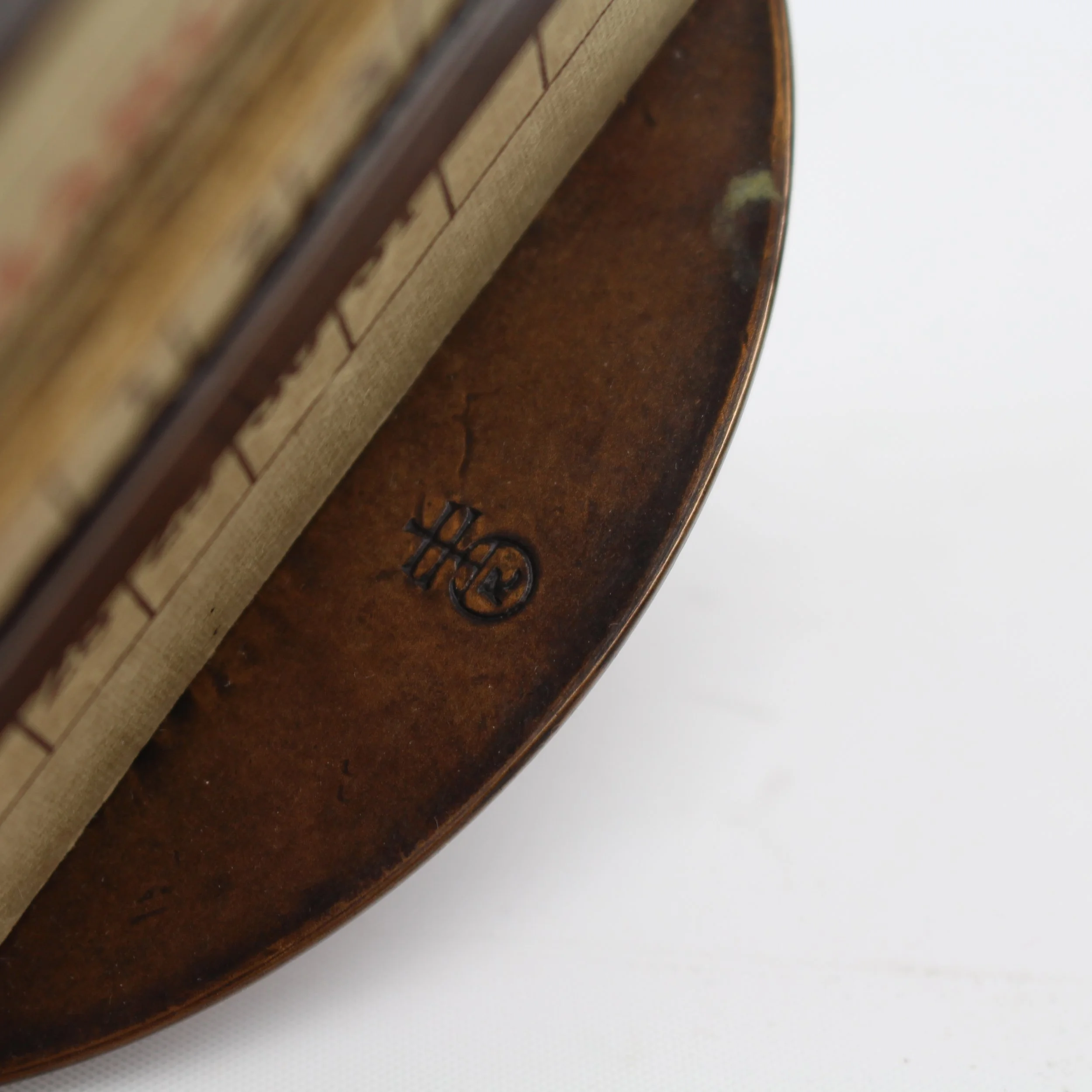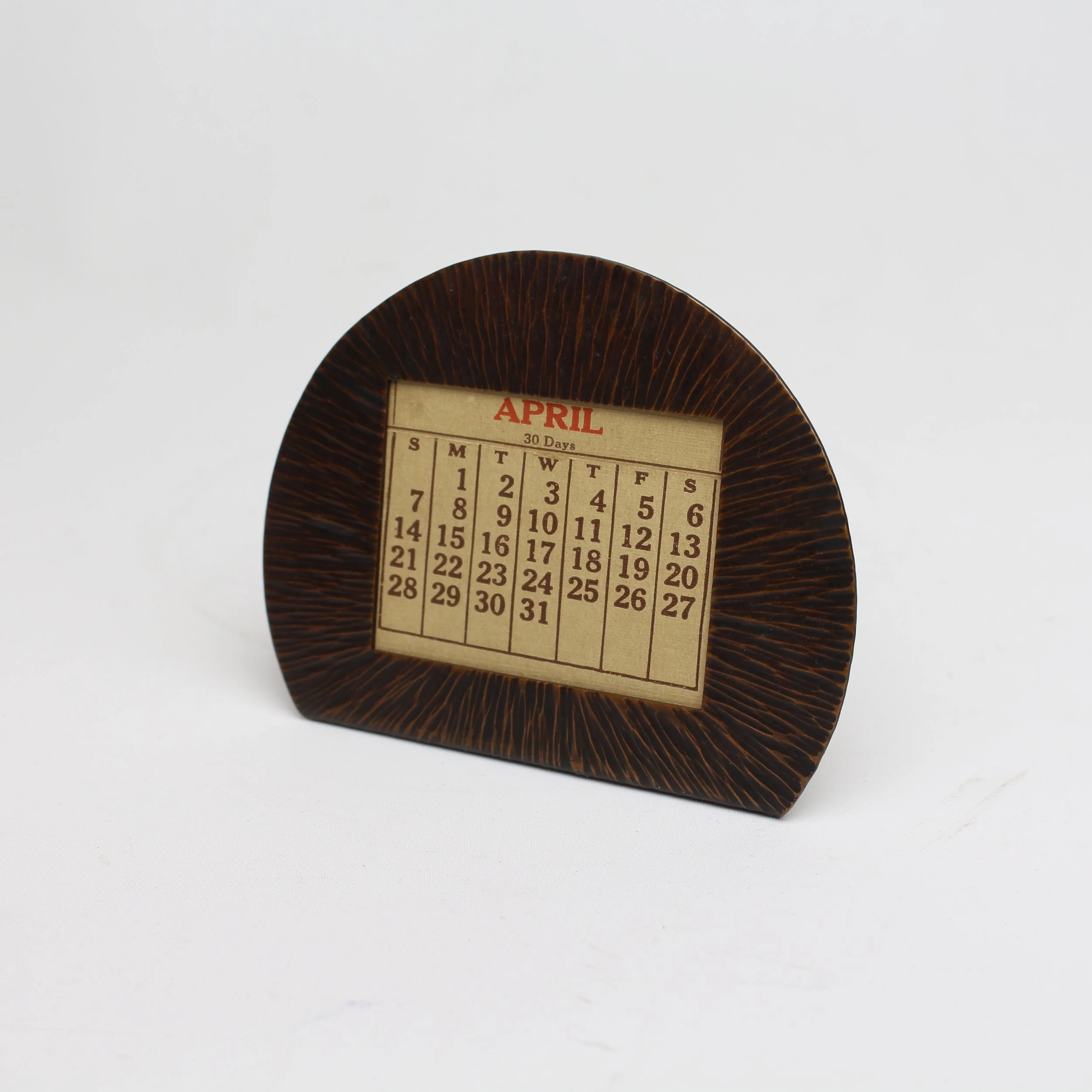 Roycroft arts and crafts hammered copper desk calendar picture frame with full set of original perpetual calendar inserts. Wonderful radial hammering with excellent “Aurora Brown” patina. Signed with impressed orb and cross mark, circa 1920’s. East Aurora, New York. 4.25”w x 3.25”h. $395.