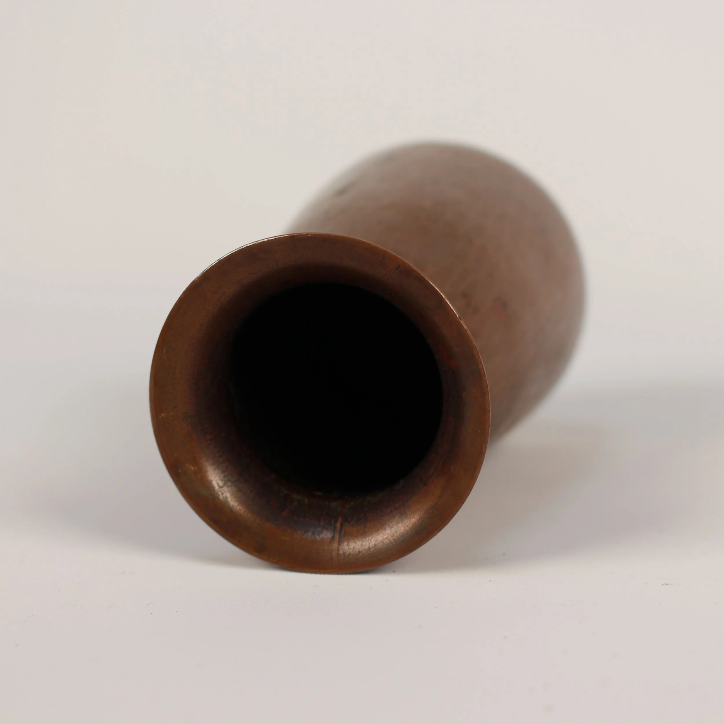 Roycroft hand hammered copper tapered vase with flaring rim. Cleaned original patina with a nice warm caramel brown color. There are a few small spots of verdigris present. Signed under base with impressed orb and cross mark, circa 1920’s. East Aurora, New York. 5”h x 2.75”d. $450.