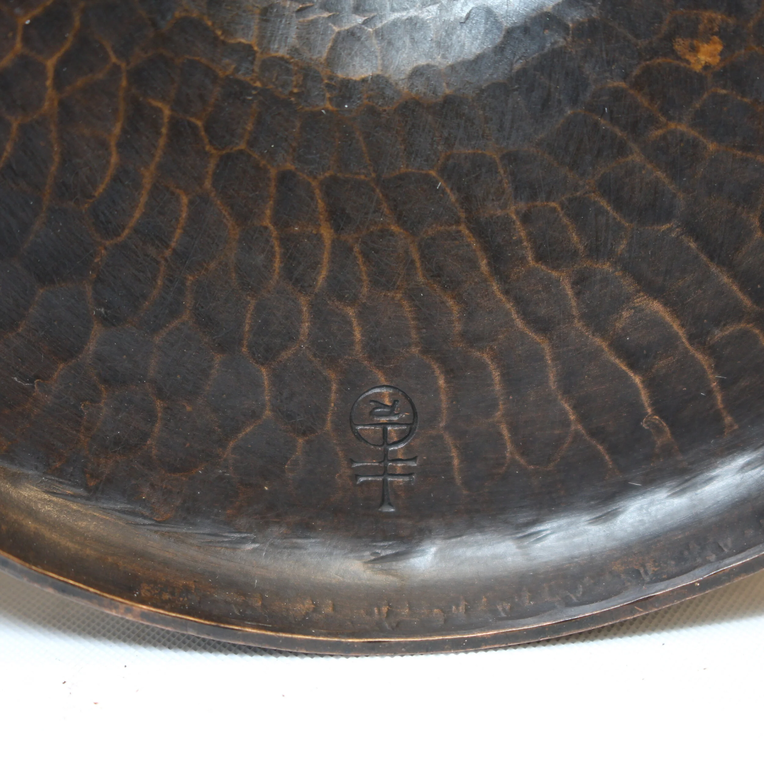 Pair, Roycroft hand hammered copper tall candlesticks with cylindrical shafts. Perfect restored patina in “Aurora Brown” finish. Each signed with impressed orb and cross mark, circa 1920. 10”h x 4.5”w. SOLD