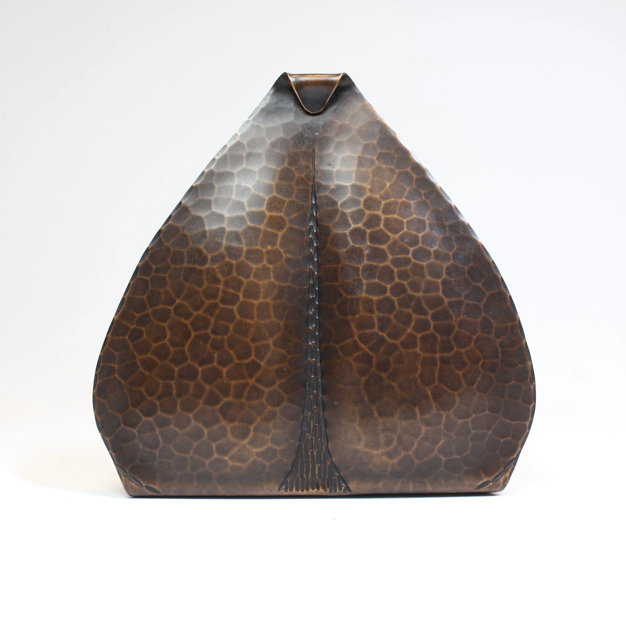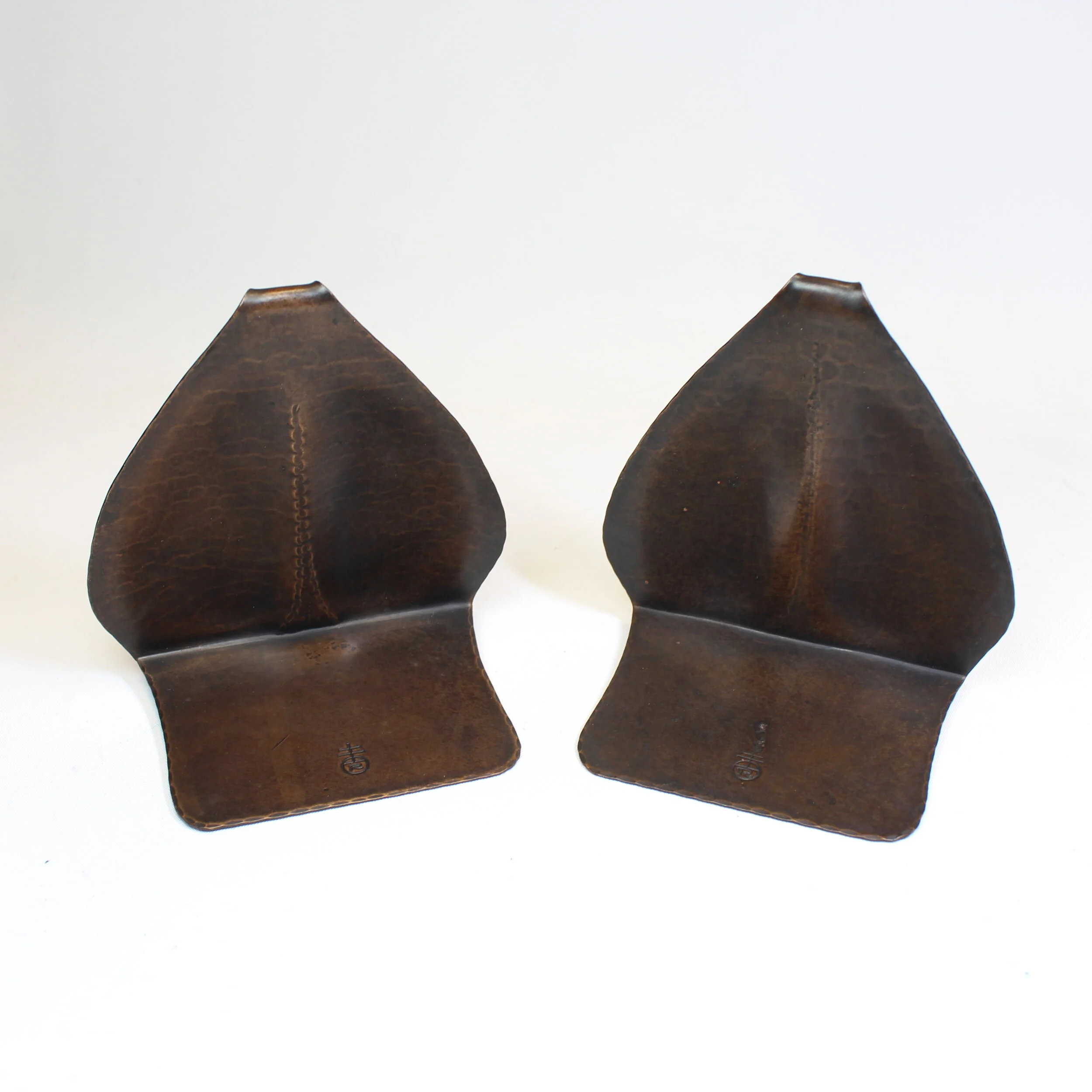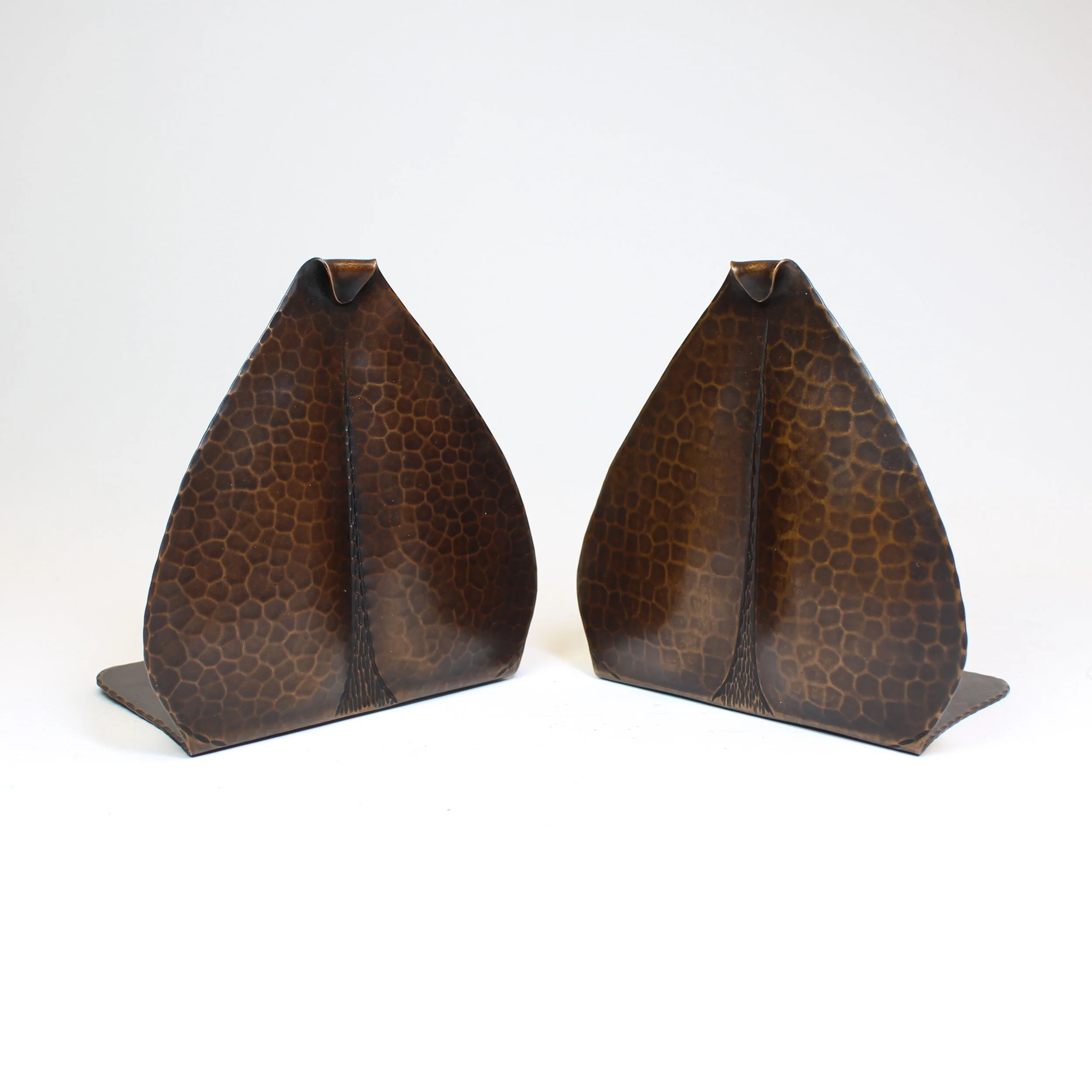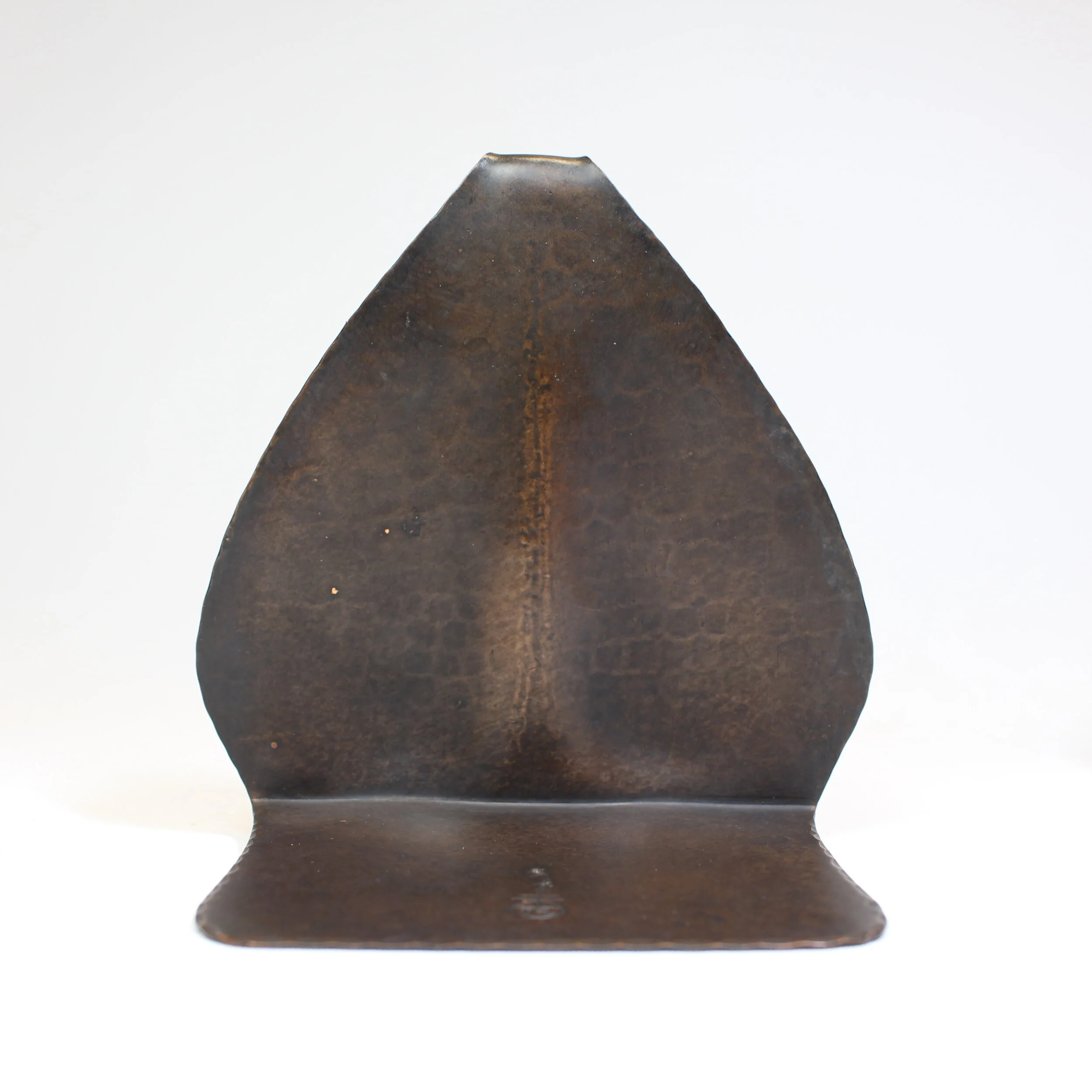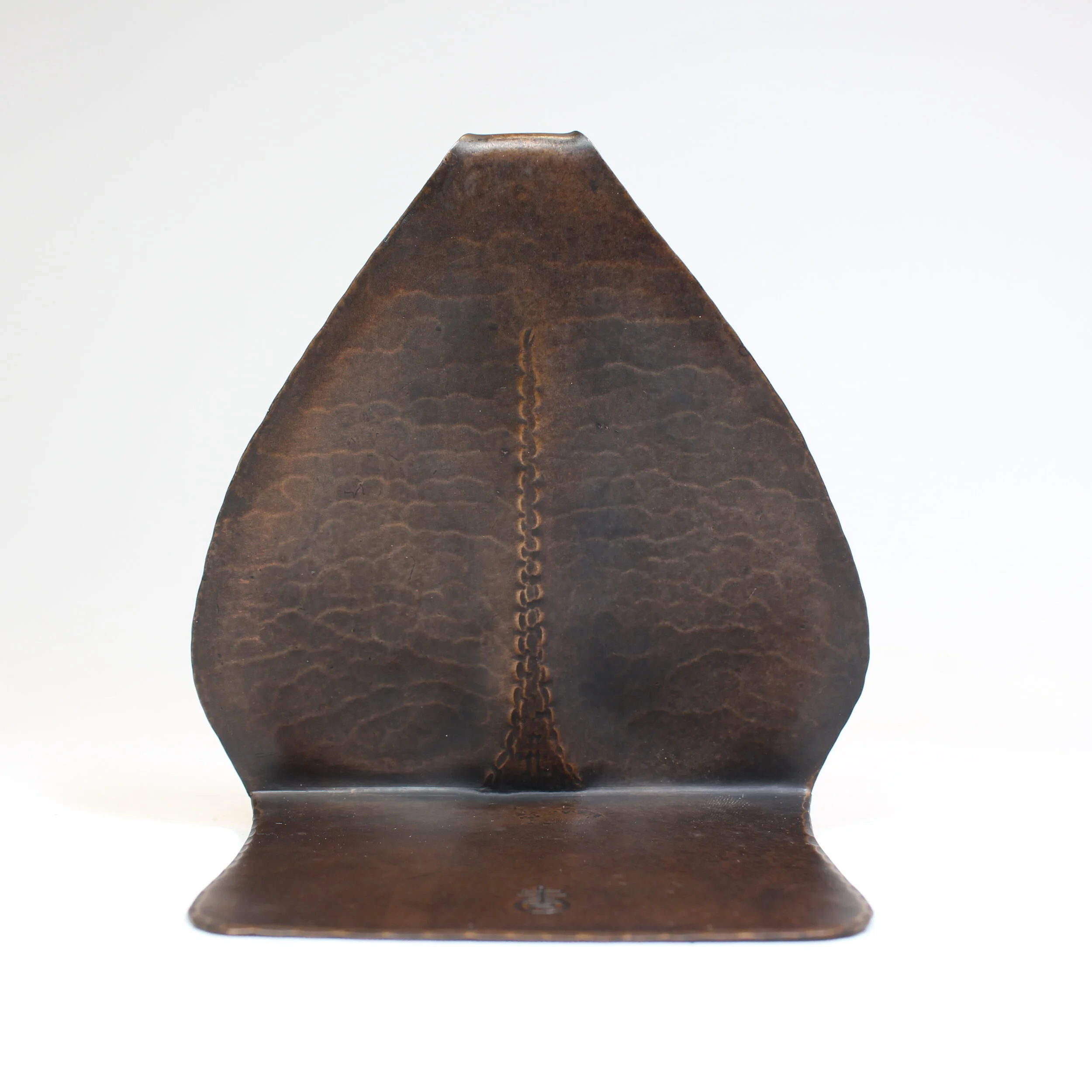 Roycroft hand hammered and tooled copper bookends with wonderful organic leaf-shape in subtle relief and curled top. This particular form is unusual, and not a commonly seen Roycroft bookend. Beautifully restored “Aurora brown” patina and finish. Each signed with impressed orb and cross mark, circa 1915-1920. 4.5”h x 4.5”w. SOLD