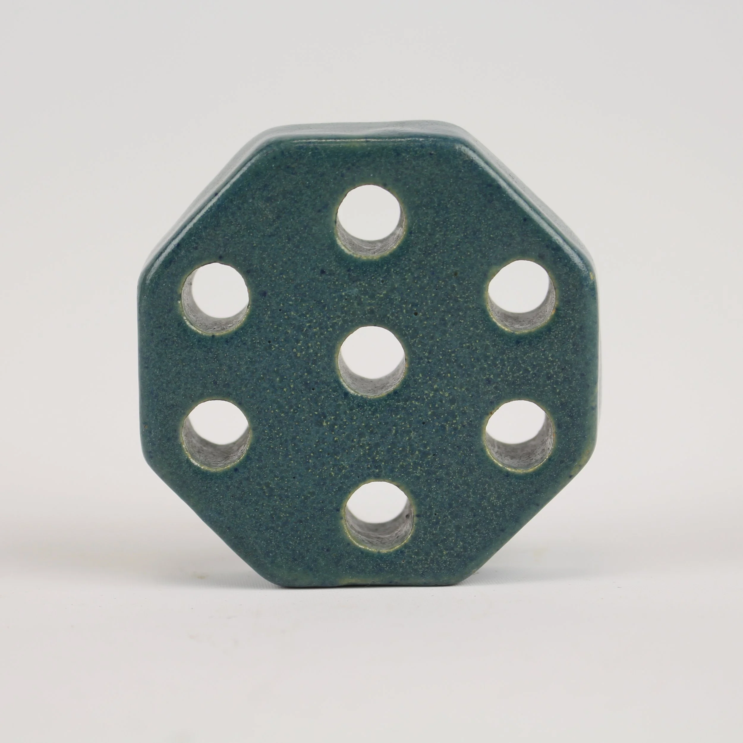 Saturday Evening Girls Club (Paul Revere Pottery) octagonal arts and crafts flower frog. Beautiful speckled blue glaze. Excellent original condition. Signed under base “SEG”. Boston, Massachusetts. Circa 1920. 2.5”d x 0.75”h. $150.