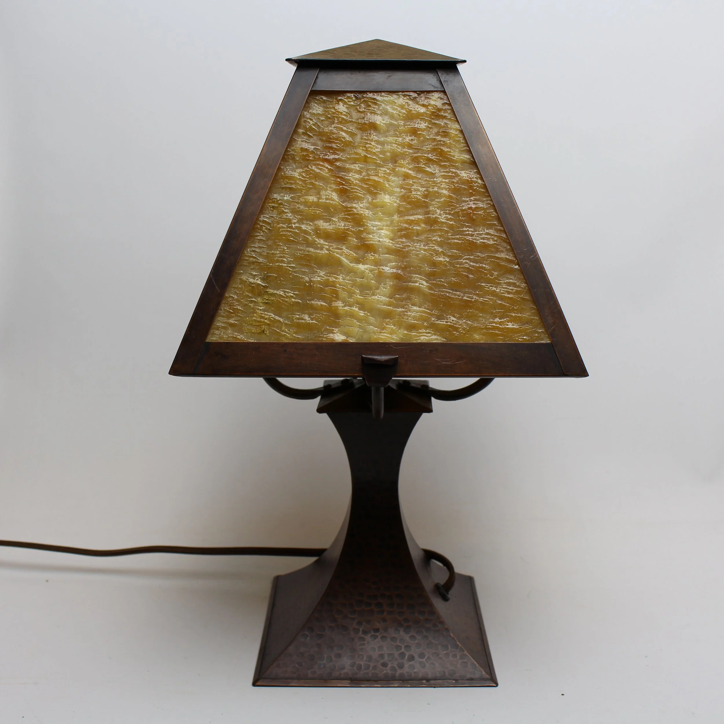 Stickley Brothers hand hammered copper four sided table lamp with original textured Kokomo opalescent glass. Beautiful new rich brown patina. Rewired with period type cloth covered cord. Unmarked. Grand Rapids, Michigan. Base: 5.5” square. Shade: 8”d side to side, 11” point to point, 6.5”h. Overall dimensions: 14”h x 8.25”w (at arms). SOLD