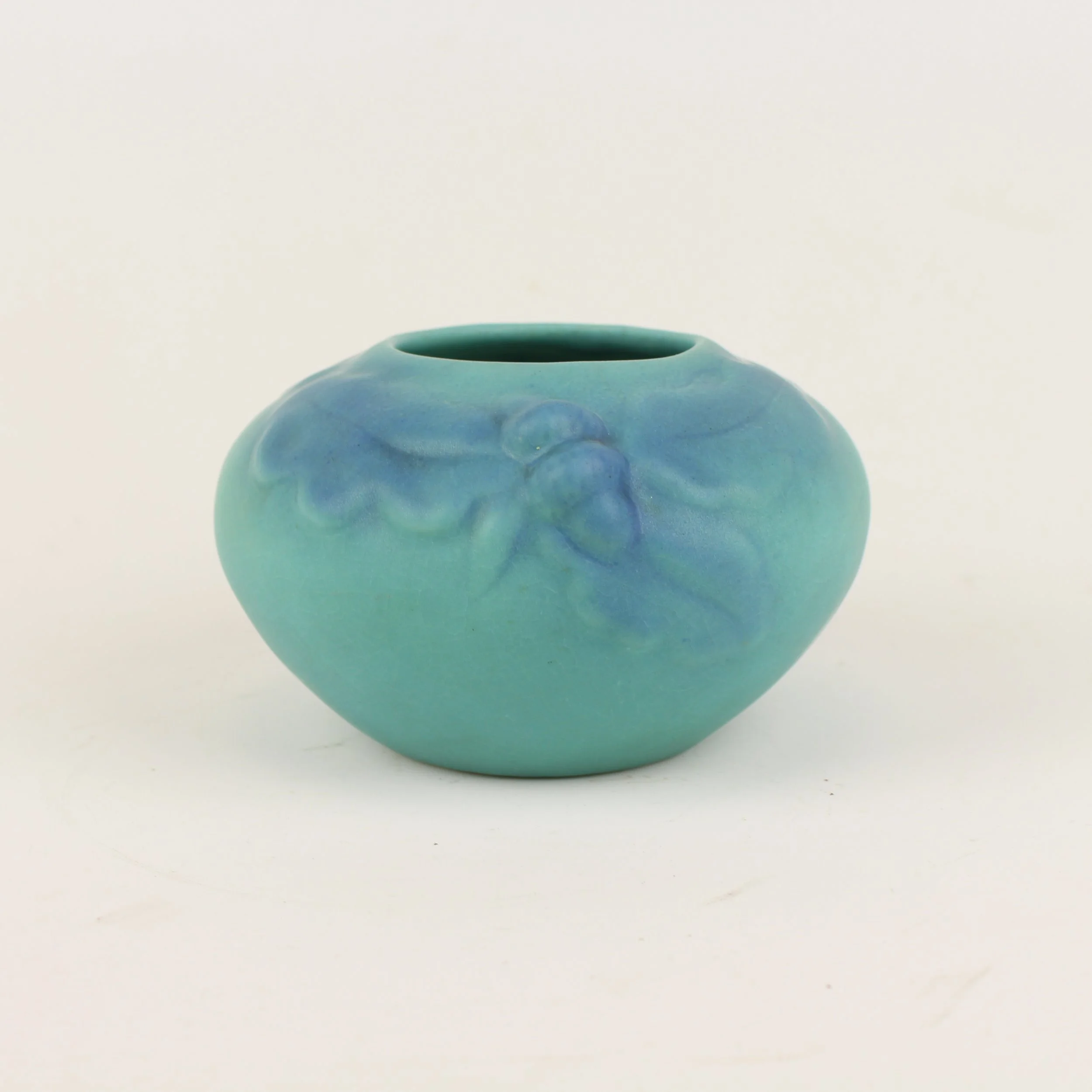 Van Briggle Art Pottery arts and crafts vase with embossed acorns and oak leaves in a matte blue glaze. A very nice crisp example of this particular design. Excellent original condition. Signed with incised “AA” logo and “Van Briggle, Colo. Spgs.” marks under base. Colorado Springs, Colorado. Circa 1920. 3.5”h x 6”d. SOLD