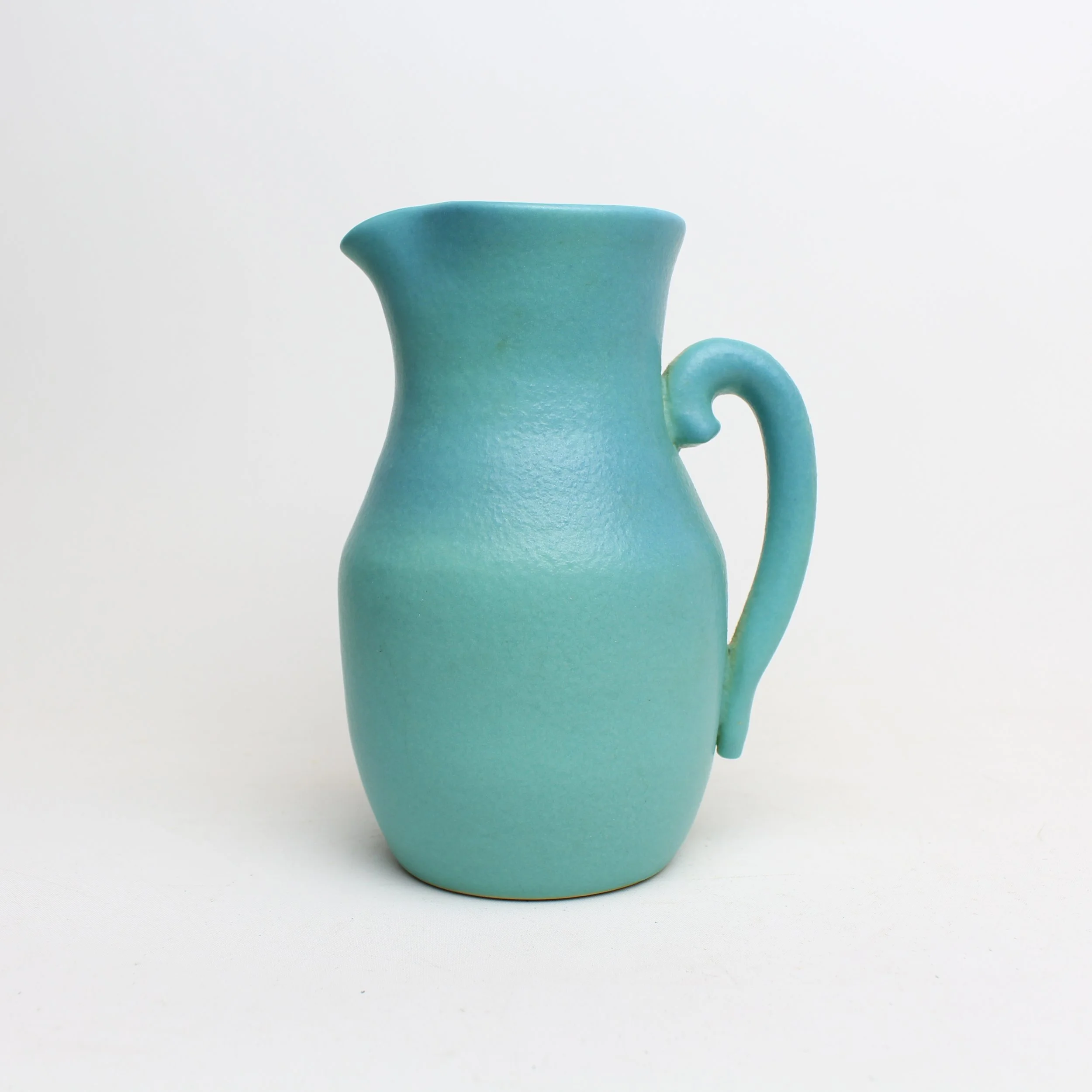 Van Briggle Art Pottery ming blue pitcher/vase. Wonderful original condition with no damage or restoration. Signed with incised “AA” logo, “F” maker’s initial and “Colo. Spgs. Van Briggle Original” in script. Artist: Fred Wills. Colorado Springs, CO. Circa 1947. 6.5”h x 4”d at widest point of body (5”d with handle). SOLD