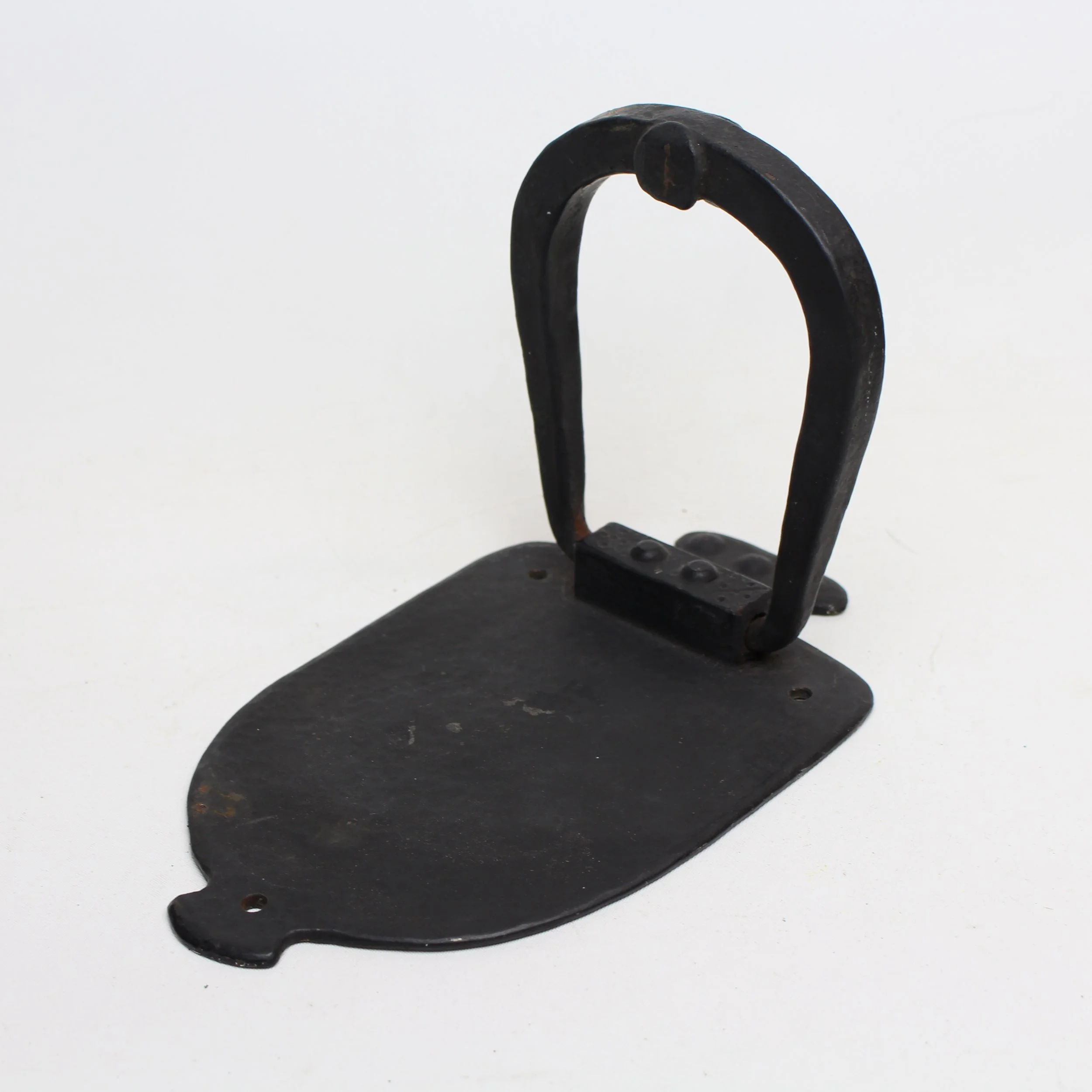 Hand wrought arts and crafts iron door knocker. Excellent original finish and condition with nice hammering throughout. Unmarked. Circa 1920’s. 7.75”h x 4.5”w x 1”d. SOLD